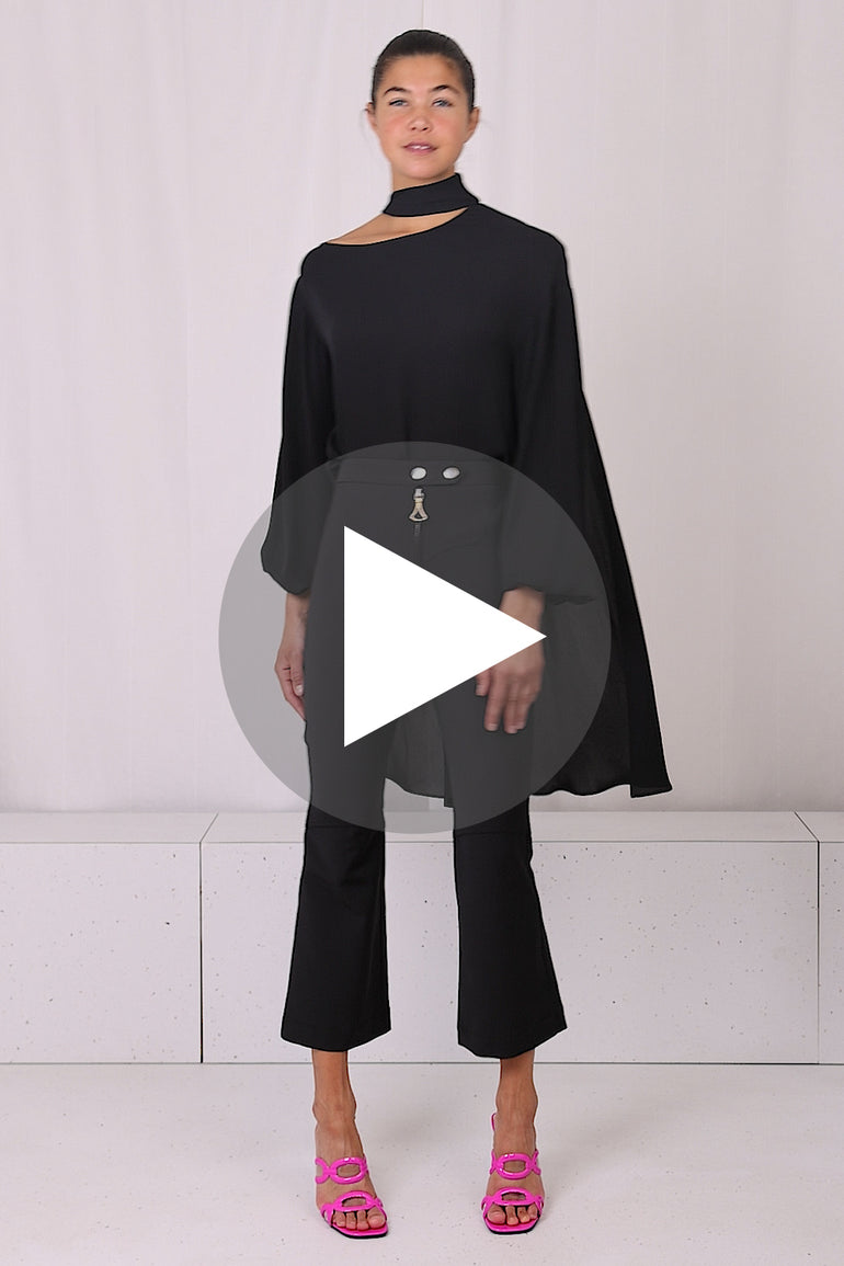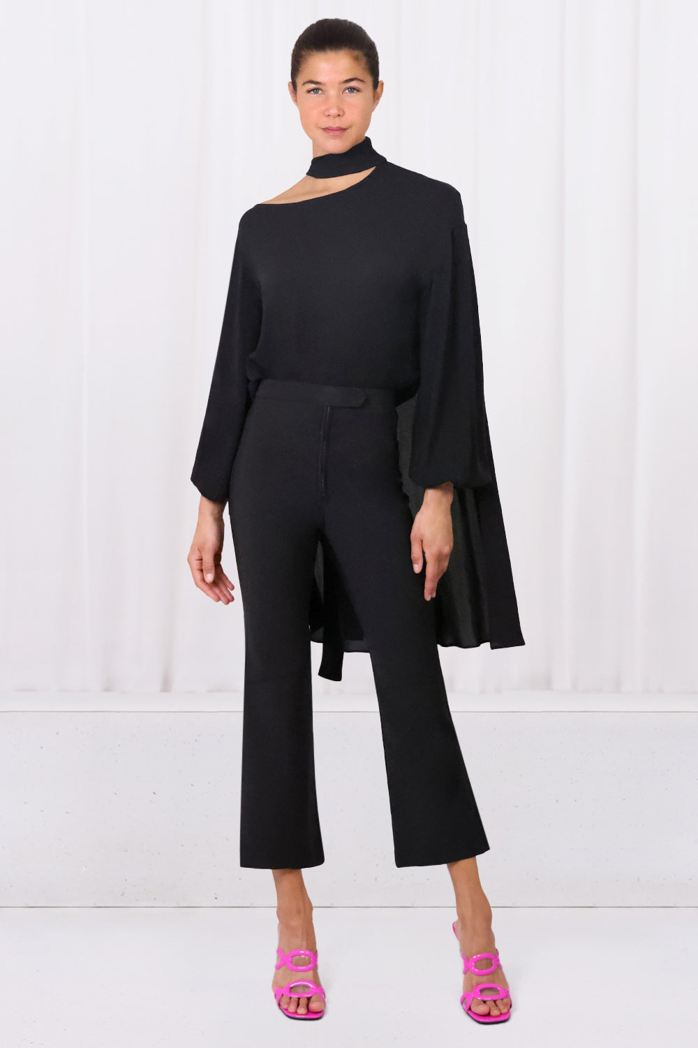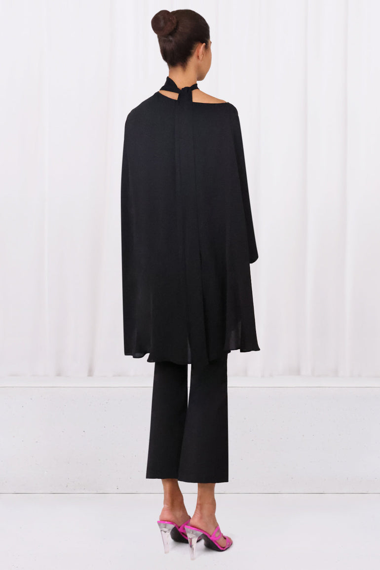 The Valentino Georgette Top in Black is fabricated from Crepe de Chine, and is a relaxed fit, shorter at the front, featuring a scarf detailing at the neck.