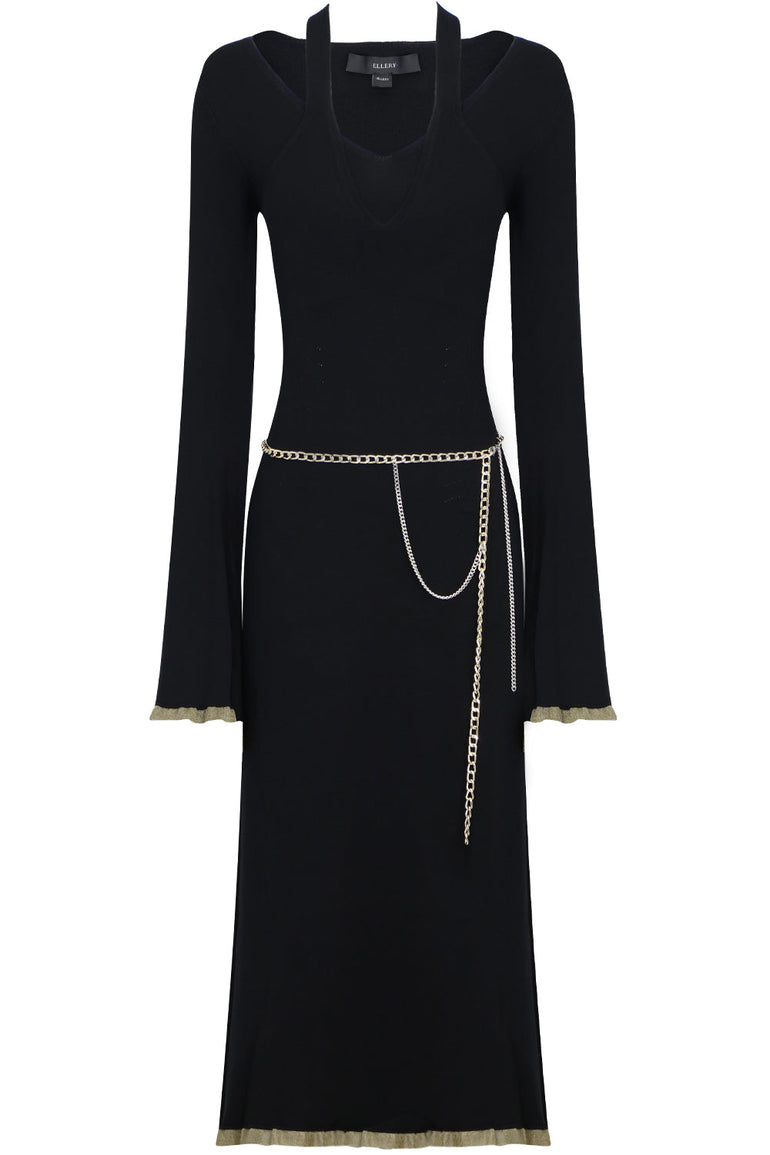 Ellery露背裙是一种双向编织连衣裙,具有长袖,领口的细节和袖子袖口和下摆的金色褶边装饰。它还具有腰部可拆卸的金色和银色硬件链。