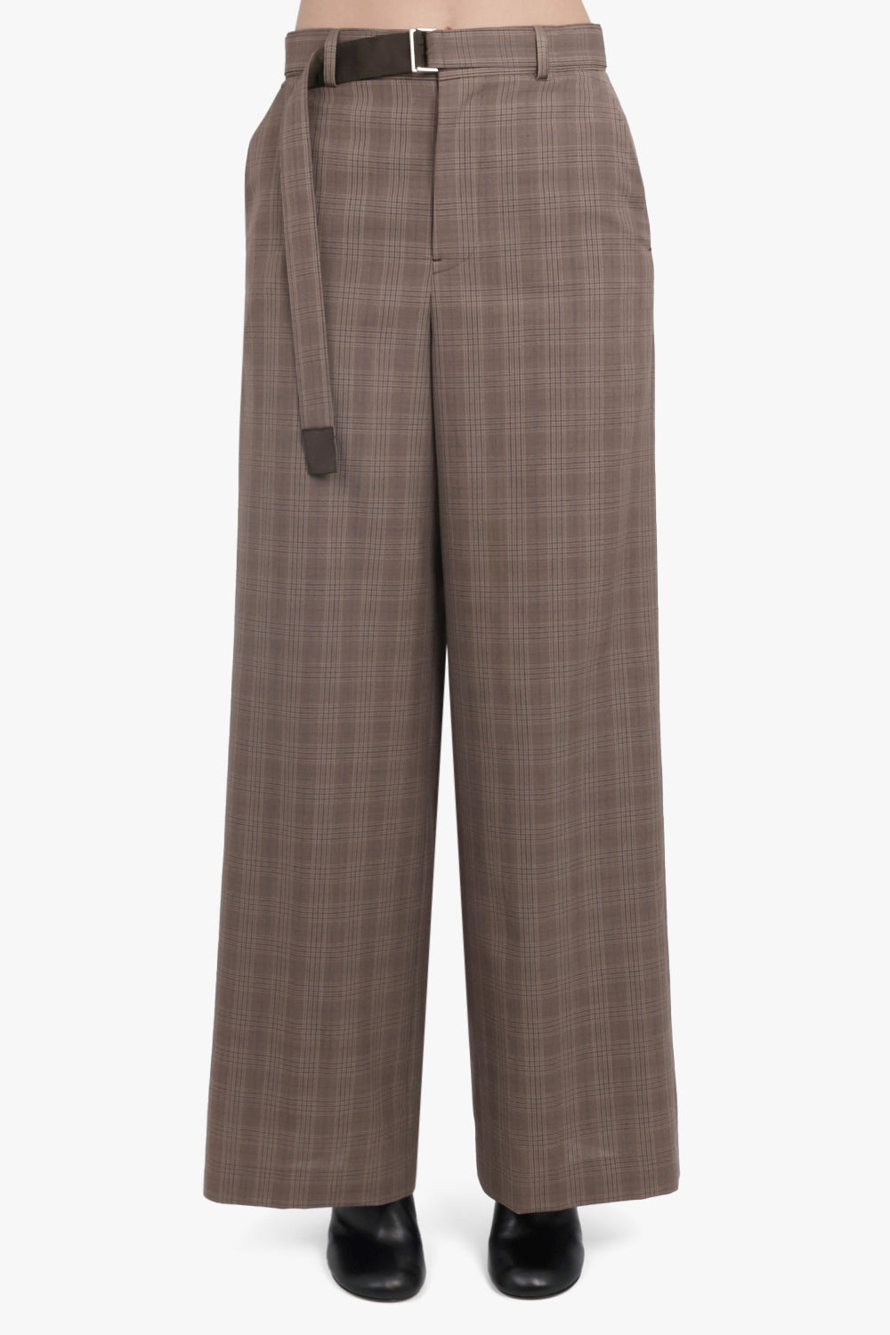 Featuring an interlock twill weave check pattern, this pant boasts a concealed front hook and zip fastening. Its high waist is accentuated by a detachable waist belt, and there are two side slit pockets for added convenience. Additionally, there is pressed crease satin trim, dart detailing at the rear, and two rear button-fastening pockets. The pant also boasts a flattering wide leg fit.