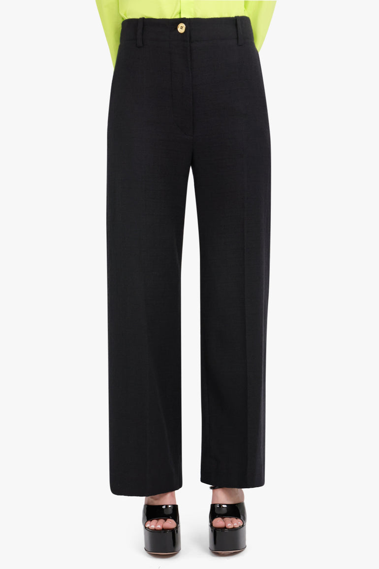 Black cotton tweed trousers. Iconic Patou silhouette. Long straight fit. Fastens via a gold-tone JP-engraved button and concealed zip at the front. Belt loops, two pockets at the sides. Signature darts at the back.