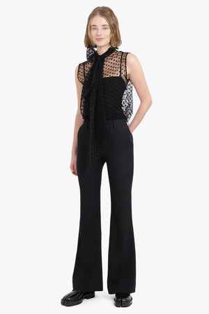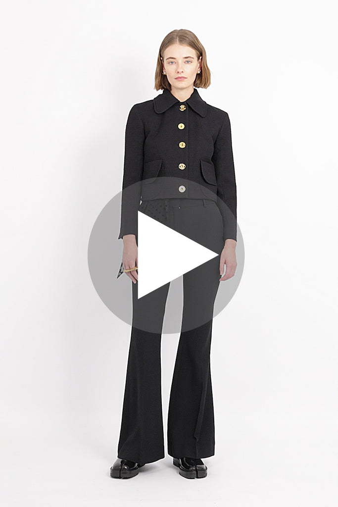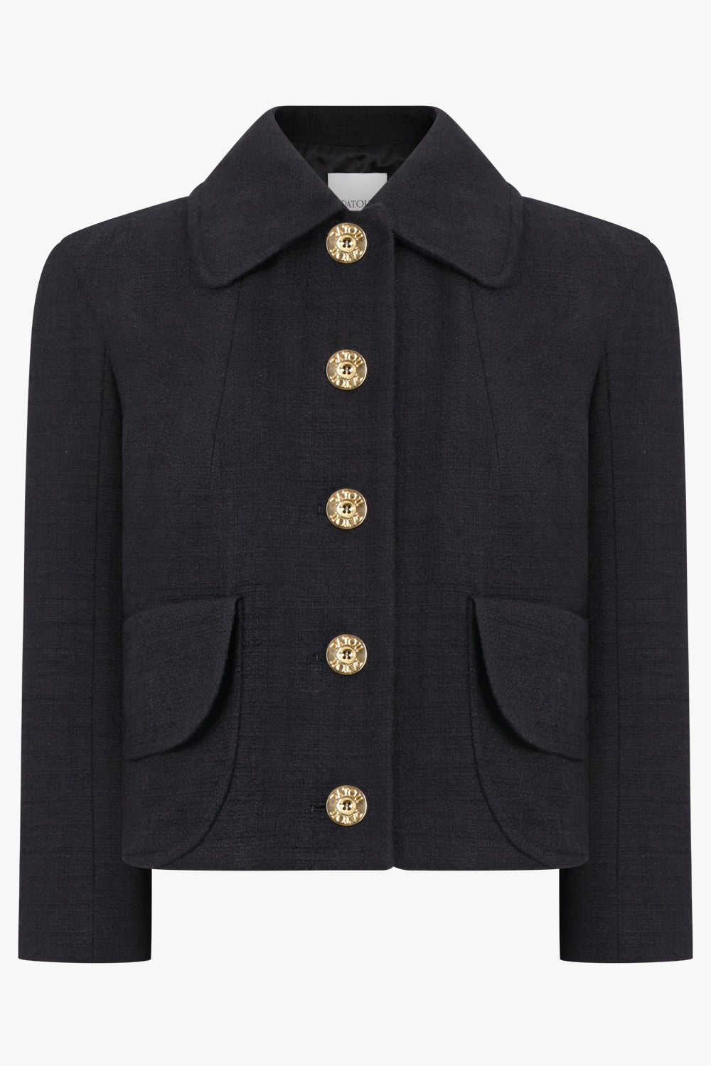 Black cotton tweed jacket. Cropped length. Wide collar. Gold-tone Patou-engraved buttons. Patch pockets. Patou label on the left sleeve. Split cuffs. Lined.