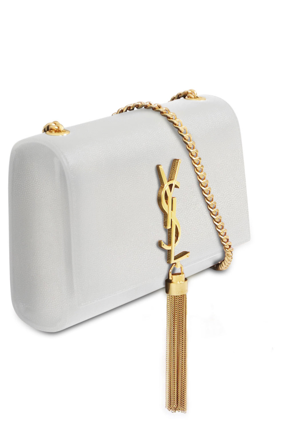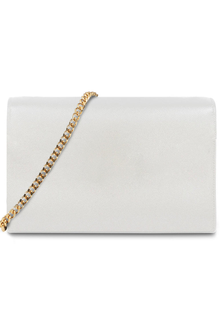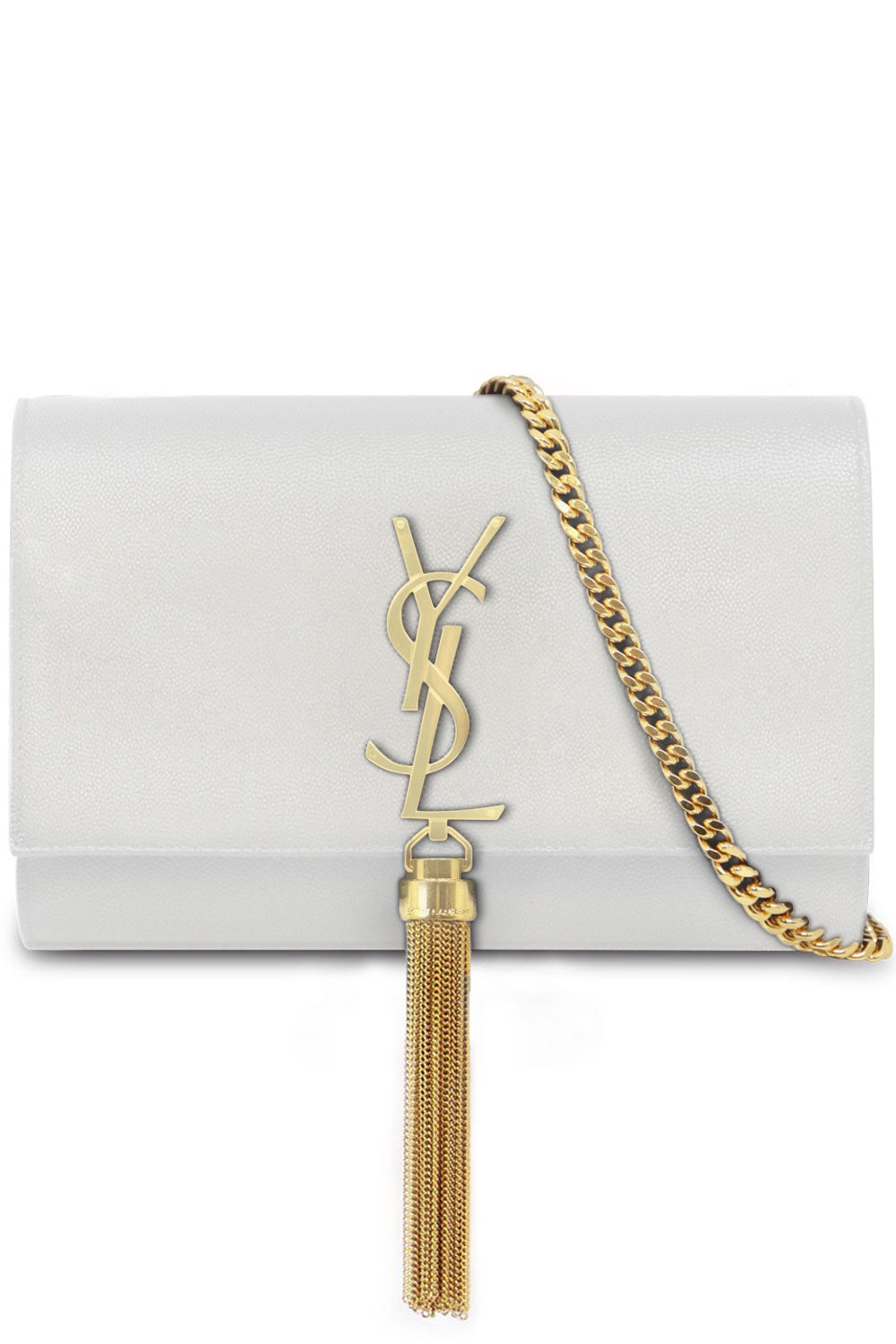 The Saint Laurent Kate Tassel Bag in nero is crafted from a calfskin leather and decorated with gold-tone metal hardware and a chain tassel detail. This bag features a signature YSL initials, leather lining, magnetised snap fastening and a chain shoulder strap.