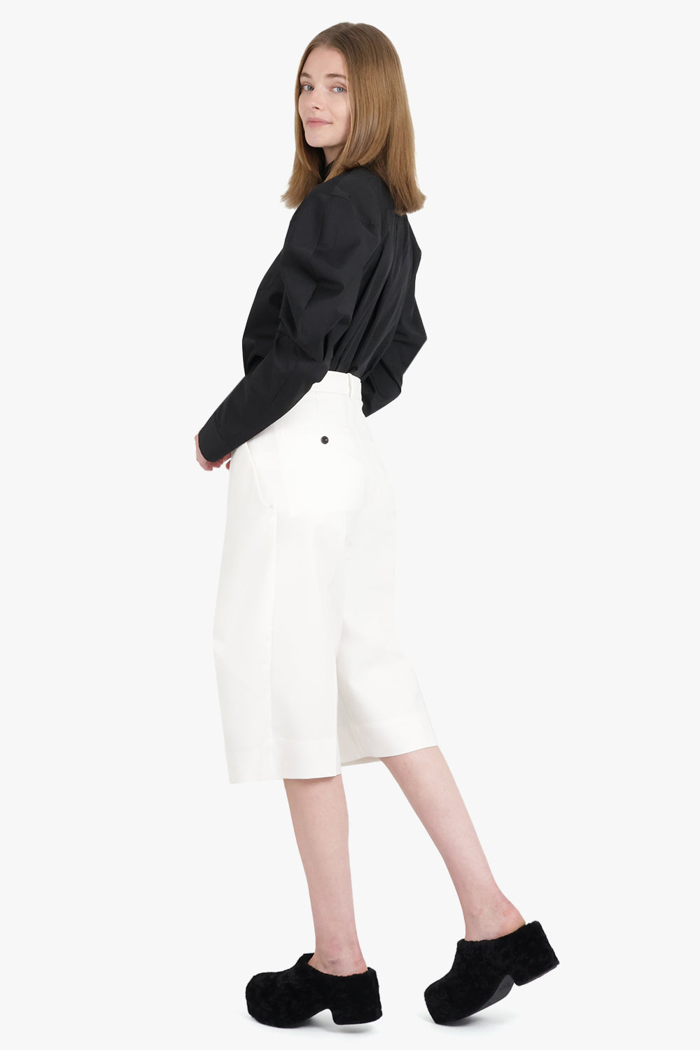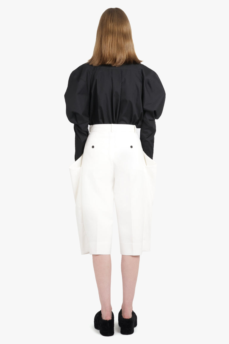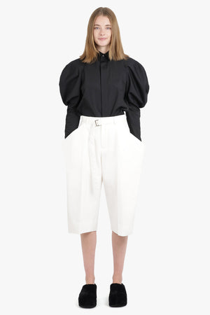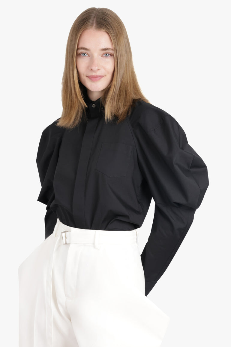 The shirt features a collar neckline, straight fit, and black fabric. It has a hidden centre front button closure and a single breast pocket. The exaggerated balloon sleeves taper down to the cuff and have a button closure. A centre back pleating adds detail to the design.