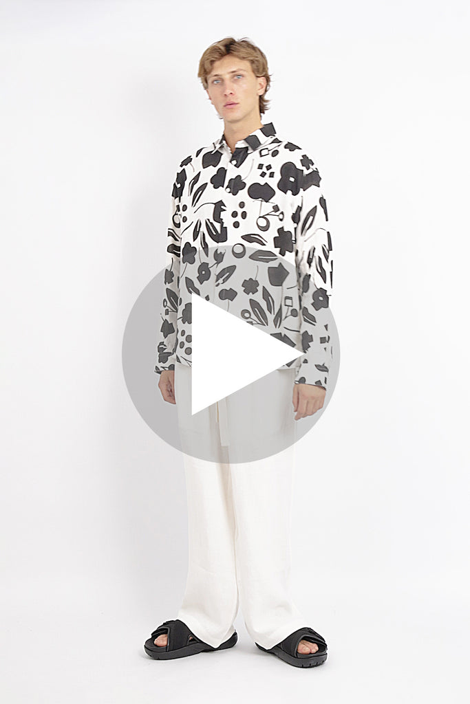 Crafted from jacquard linen fabric, it features a straight fit, pointed collar, button placket, and square cuffs with mother-of-pearl buttons. The statement black flower pattern elevates any look.