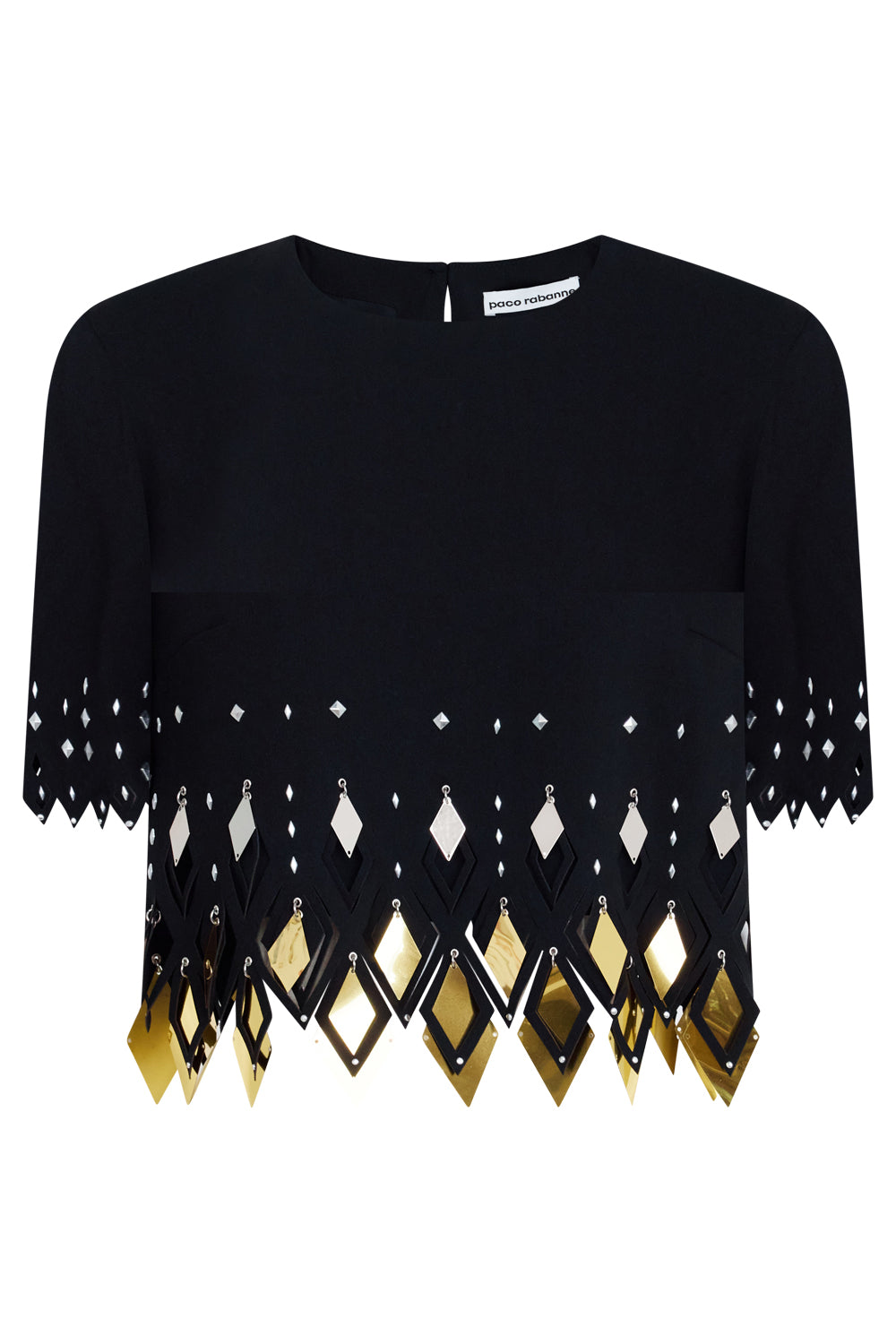 Rabanne's AW23 collection is infused with innovative designs punctuated by metallic accents, as showcased by this black crop top. Its simple silhouette is elevated by cut-outs, silver-tone studs and hanging rhombus-shaped paillettes in an assortment of sizes.