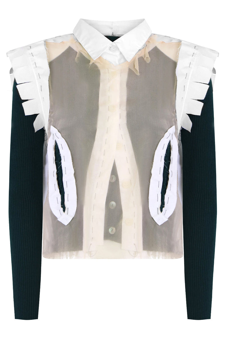 Maison Margiela分层编织顶部是一款针织和衬衫在彼此之上分层的对比,将两个概念绑定到一个。底层由长袖针织底座组成,同时外层由前部,荷叶边肩部和尖套构成。