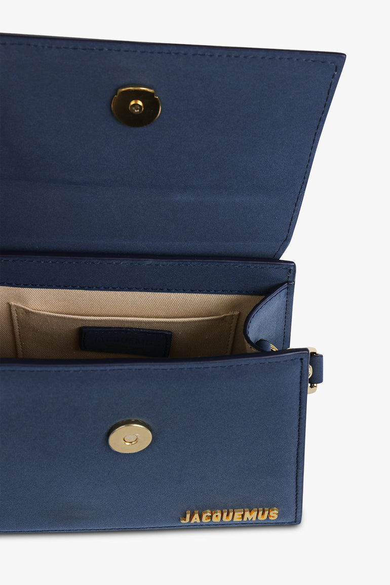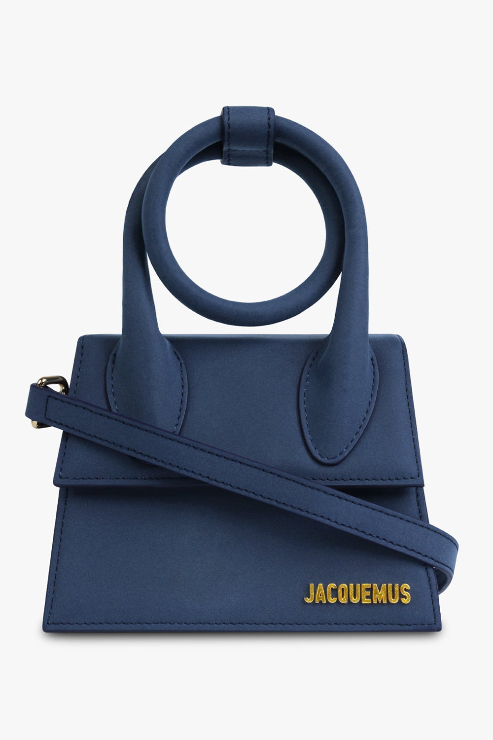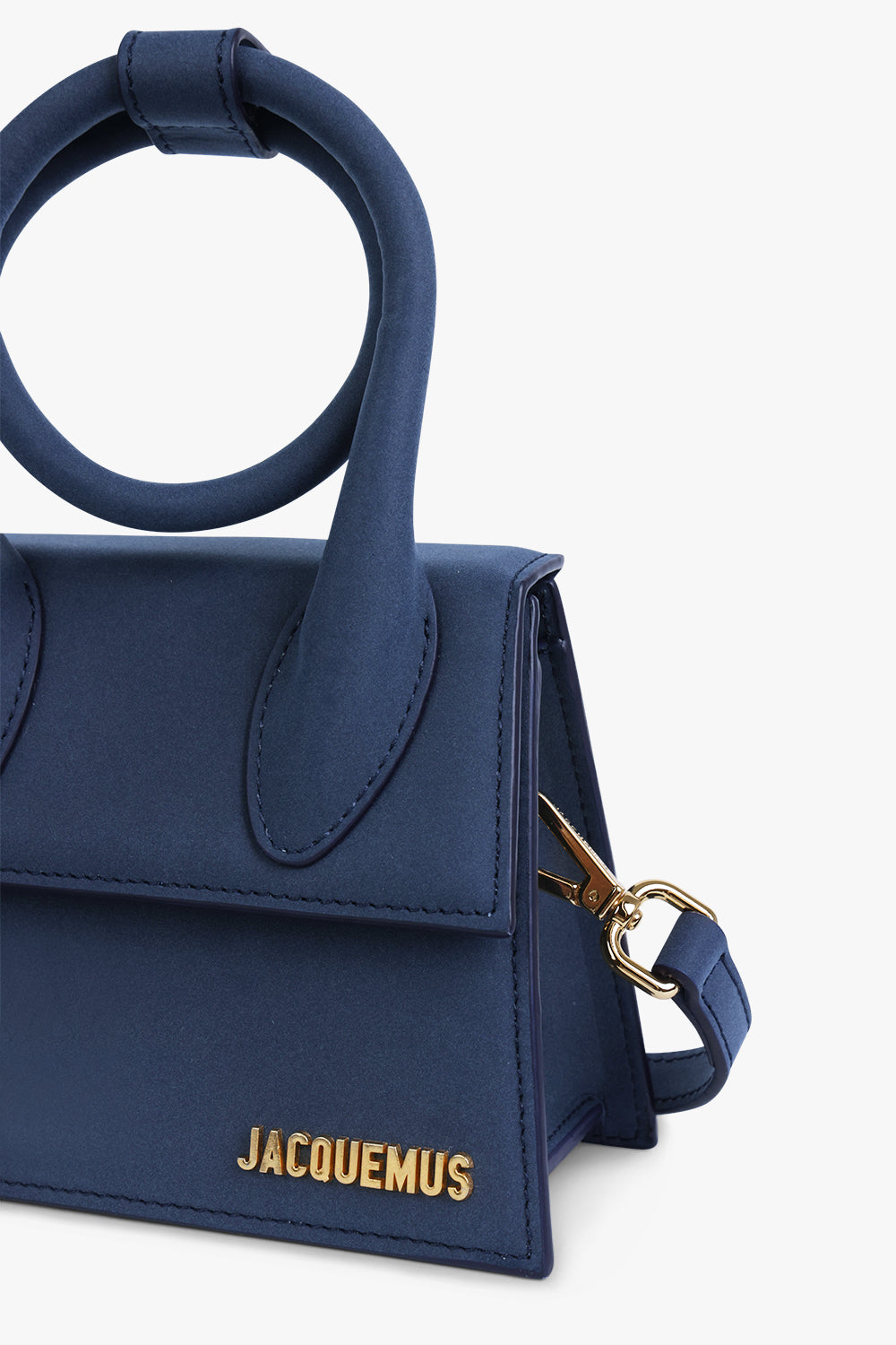 The Jacquemus Le Chiquito Noeud Bag in Dark Navy features a flexible and adjustable round top handle, a detachable shoulder strap, a foldover top with magnetic closure, has a main internal compartment and a gold-tone logo plaque. This bag can be worn cross-body and on the shoulder.