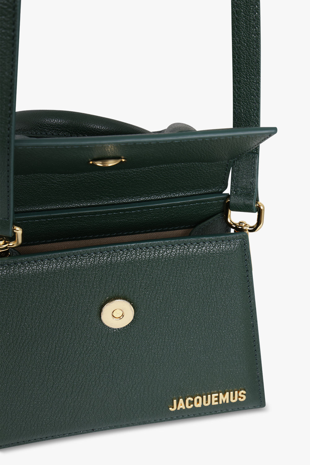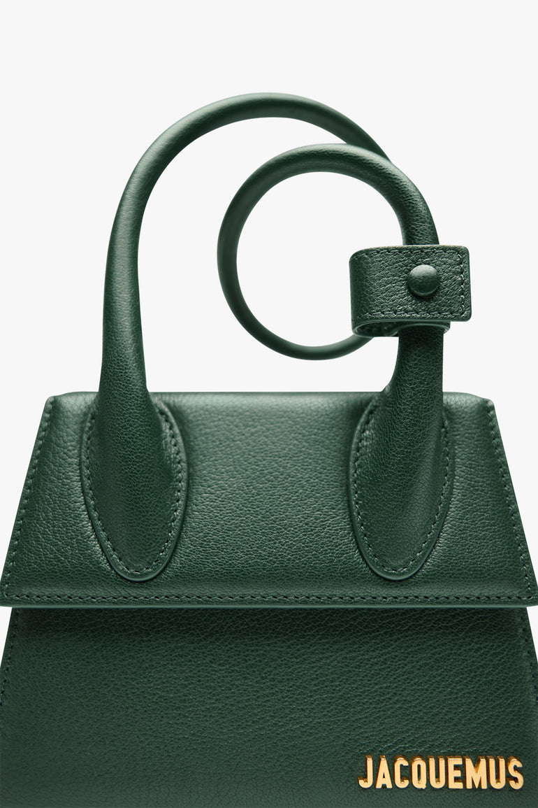 The Jacquemus Le Chiquito Noeud Bag in Dark green features a flexible and adjustable round top handle, a detachable shoulder strap, a foldover top with magnetic closure, has a main internal compartment and a gold-tone logo plaque. This bag can be worn cross-body and on the shoulder.