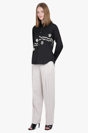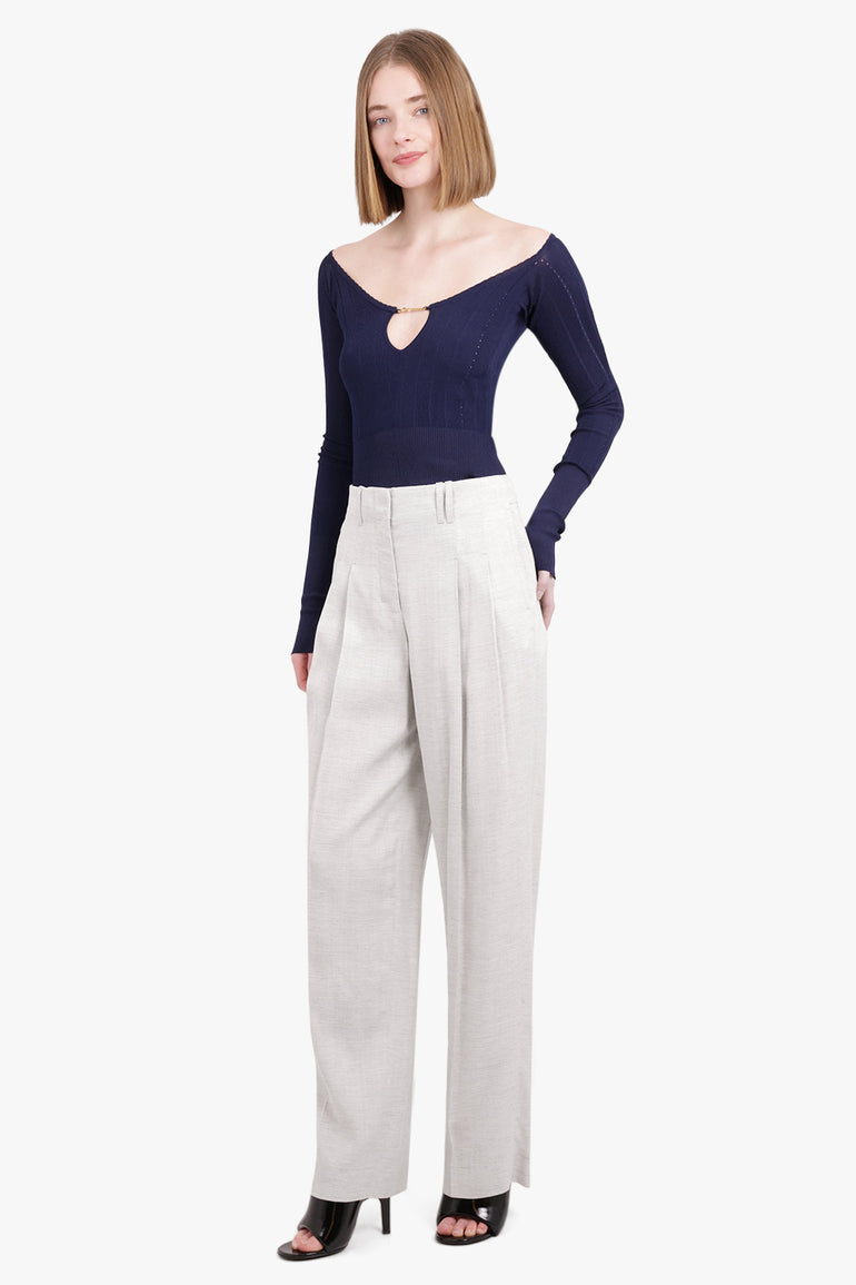 The Le Pantalon Titolo in Light Grey offers a high-waisted, loose fit design with a hidden zip and button closure, pressed pleats, side-seam pockets, and a split waistband in the back for added comfort. Complete with a back welt pocket featuring a "J" button loop, these pants are both functional and stylish.
