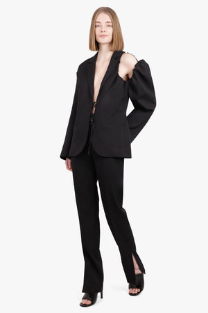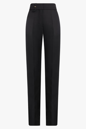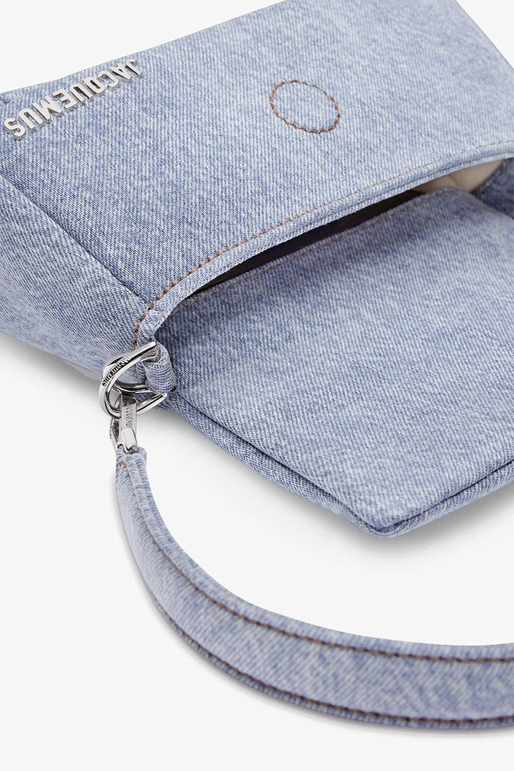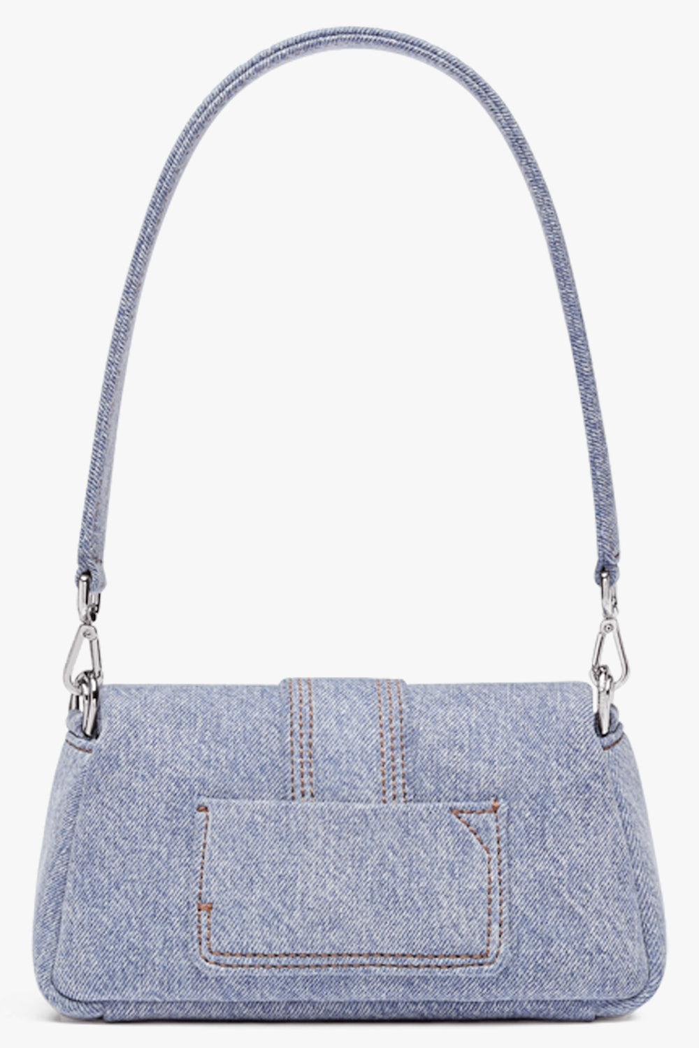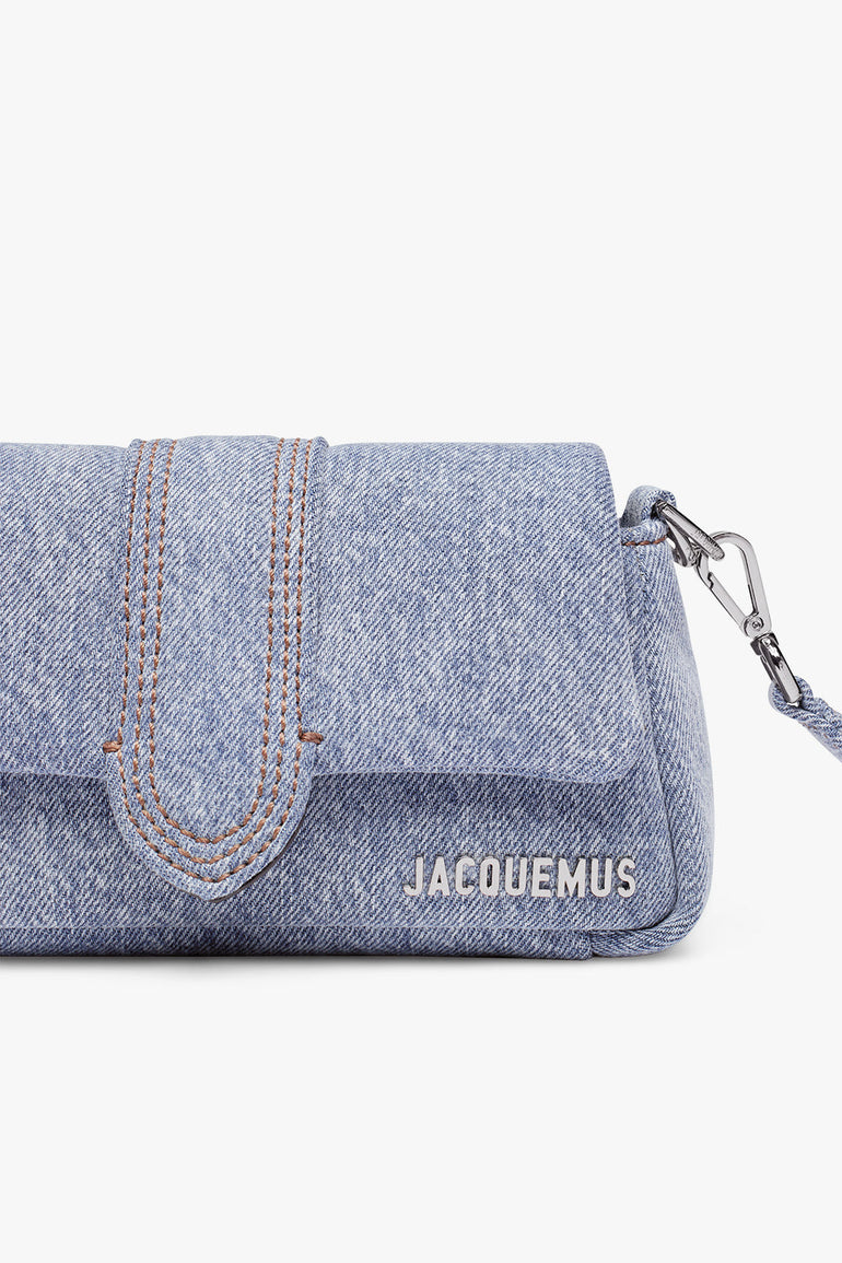 Le Petit Bambimou's model boasts a blue denim body, magnetic flap closure, dual shoulder straps for shoulder or crossbody wear, engraved lobster clasp, back patch pocket, internal pocket, silver metal logo & hardware, cotton lining.