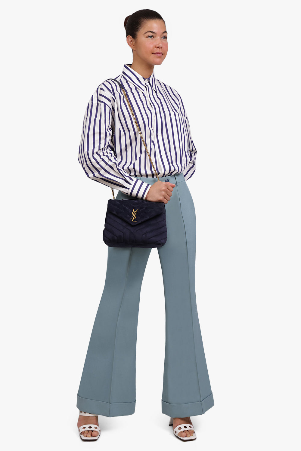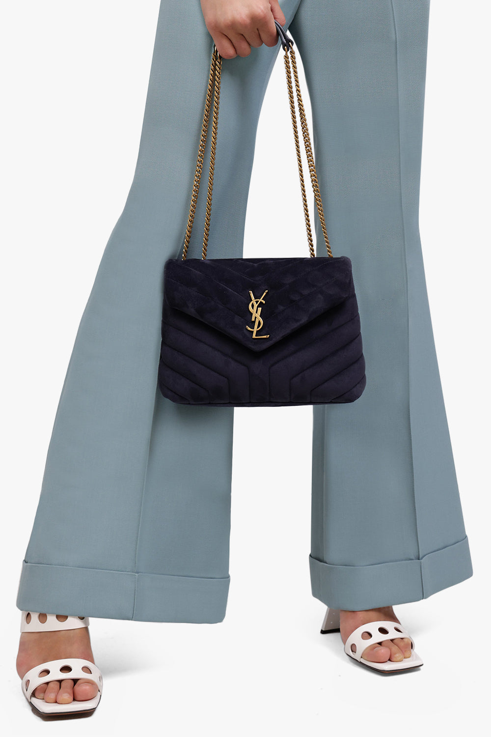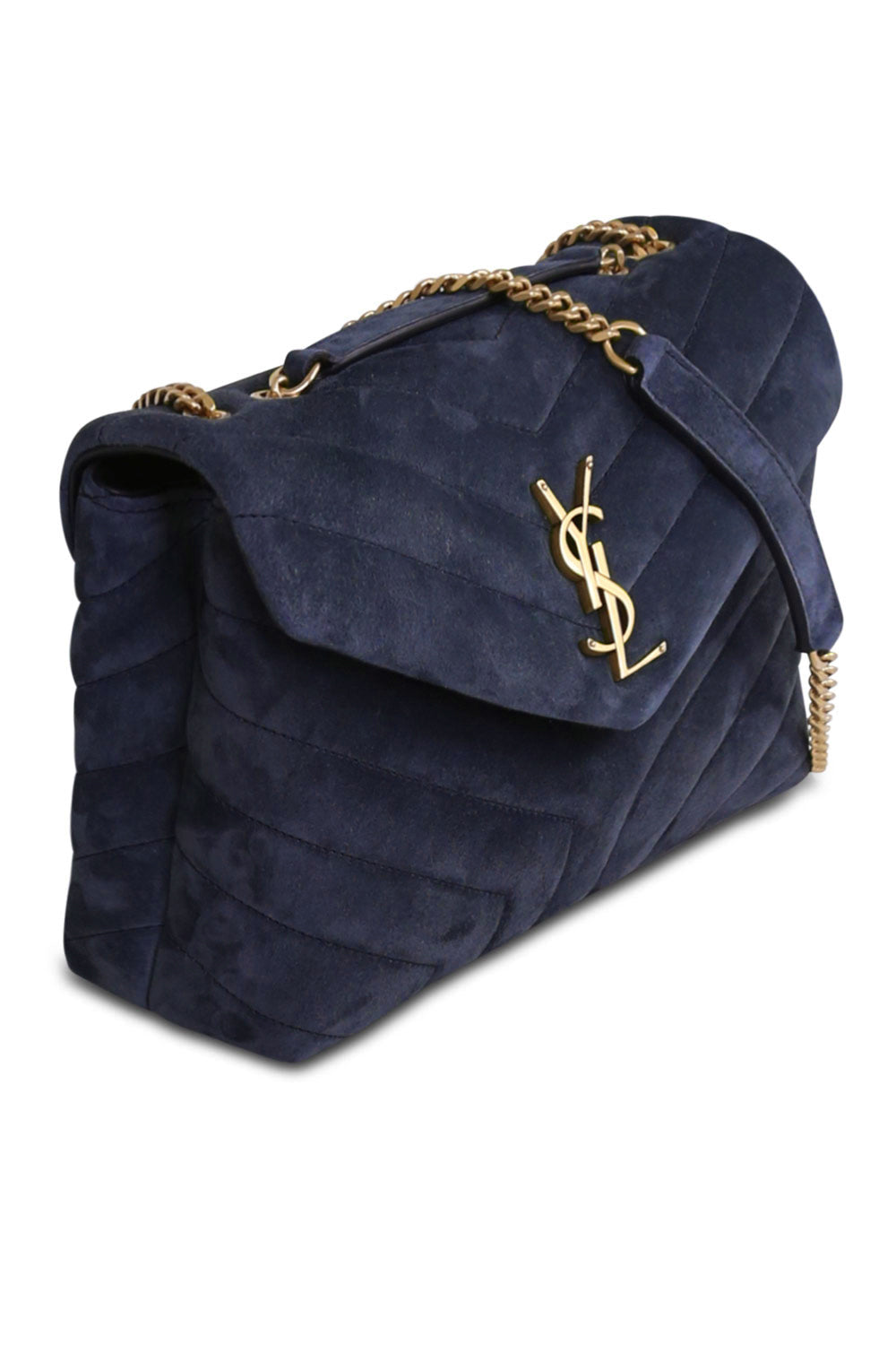 The Saint Laurent Loulou Small Flap Bag is made of a supple “Y” quilted suede fabrication. Featuring a leather and metal chain shoulder strap that can be worn doubled on the shoulder. Finished with YSL hardware.