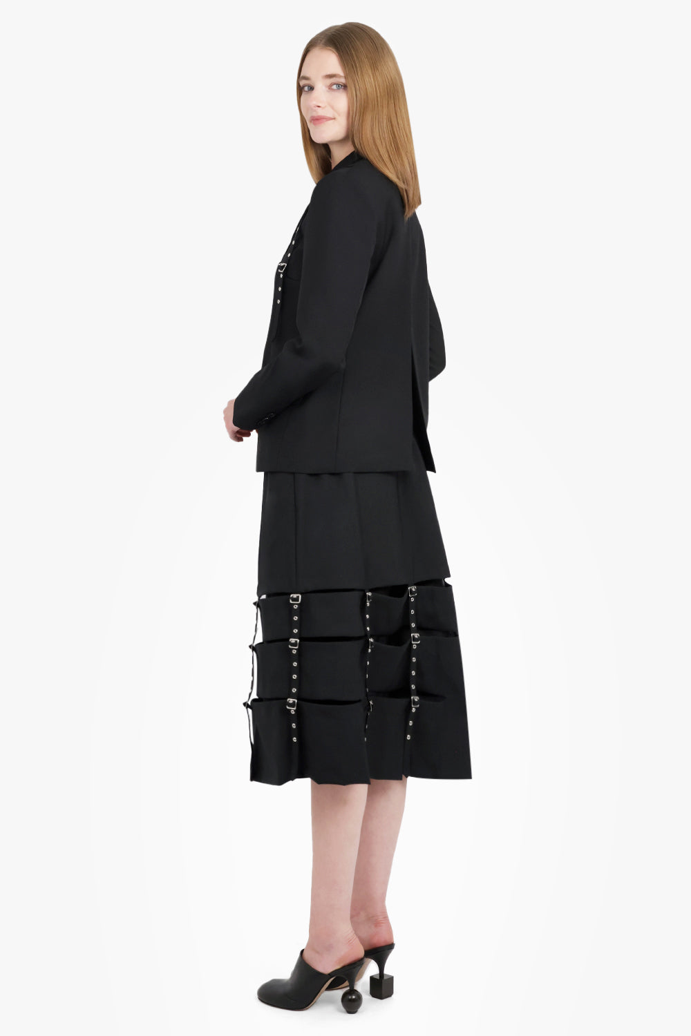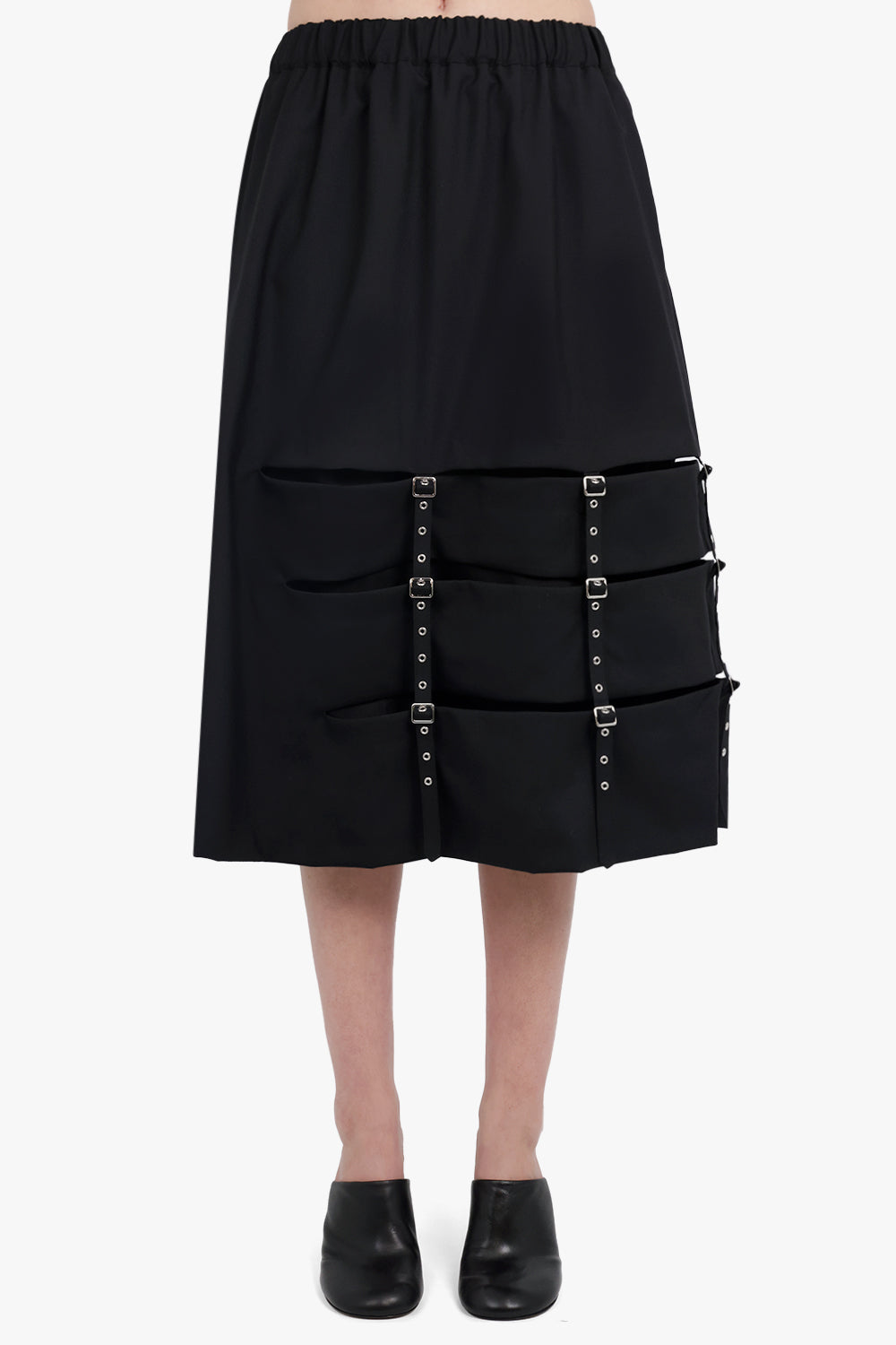 This midi skirt features a split side suspender detail with an elasticated drawstring waist and buckled straps. It is fully lined and falls at a mid-length.