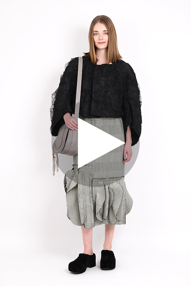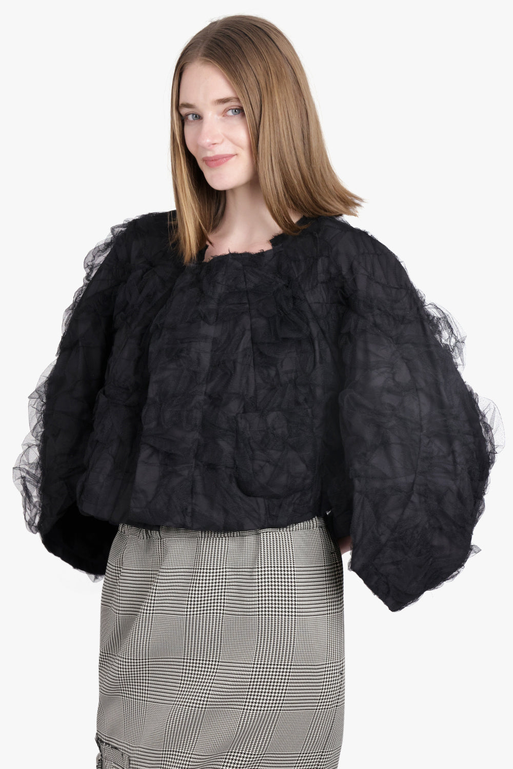 The Comme Des Garçons Asymmetric Ruffle Tulle Cropped Jacket is crafted in a tulle material. The style is cropped with an asymmetric front closure and a rounded neckline.