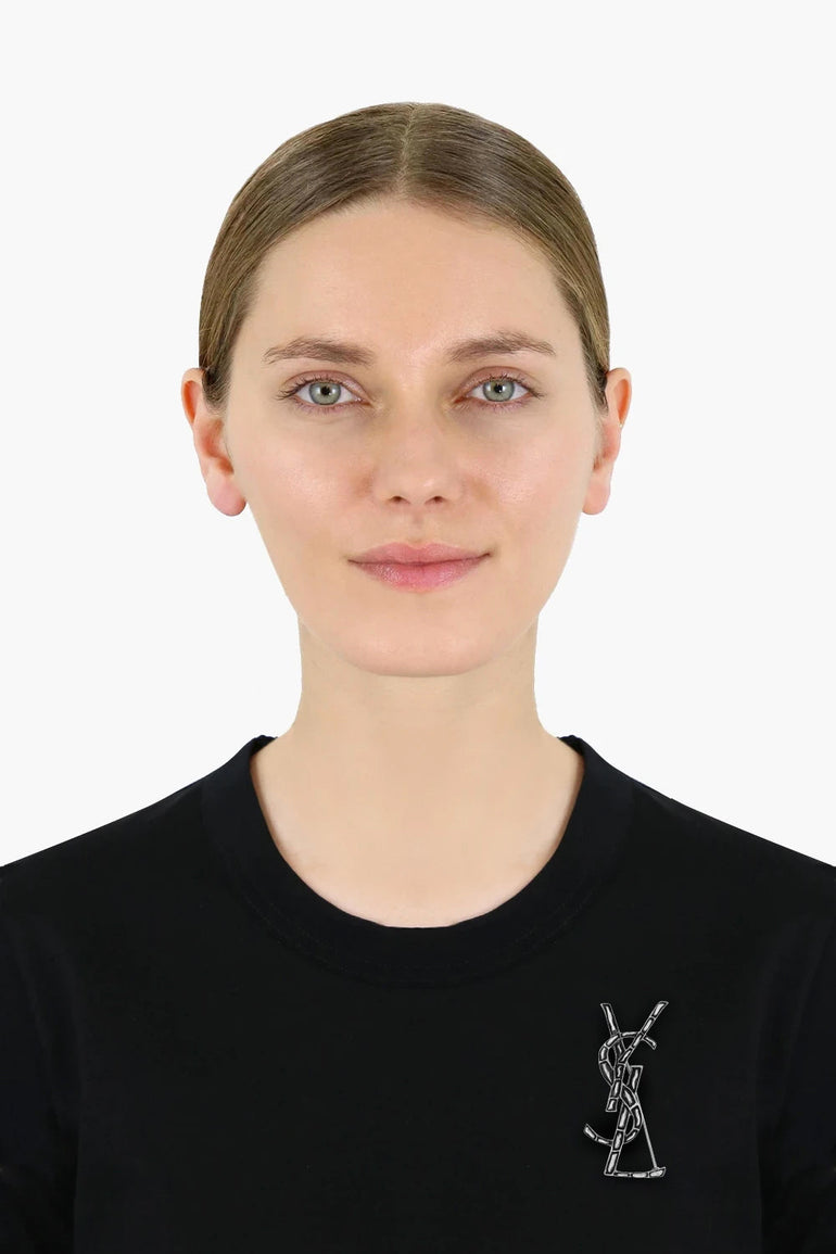 Saint Laurent胸针具有带纹理的鳄鱼设计的金属中的隔行截率的YSL首字母。