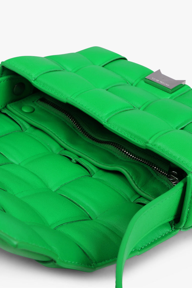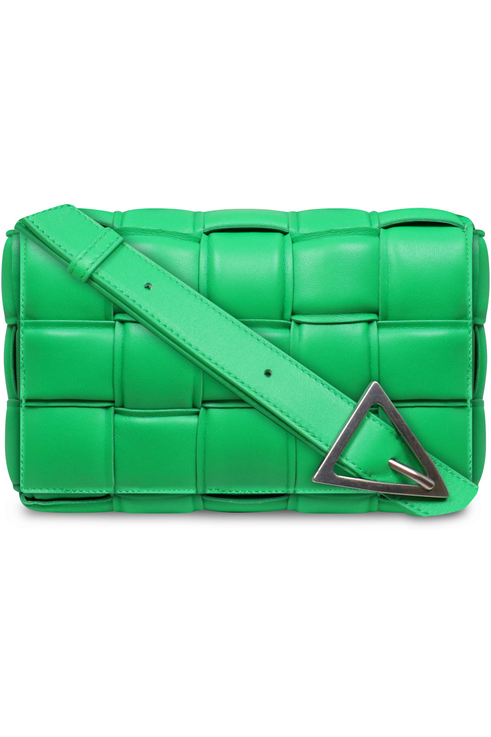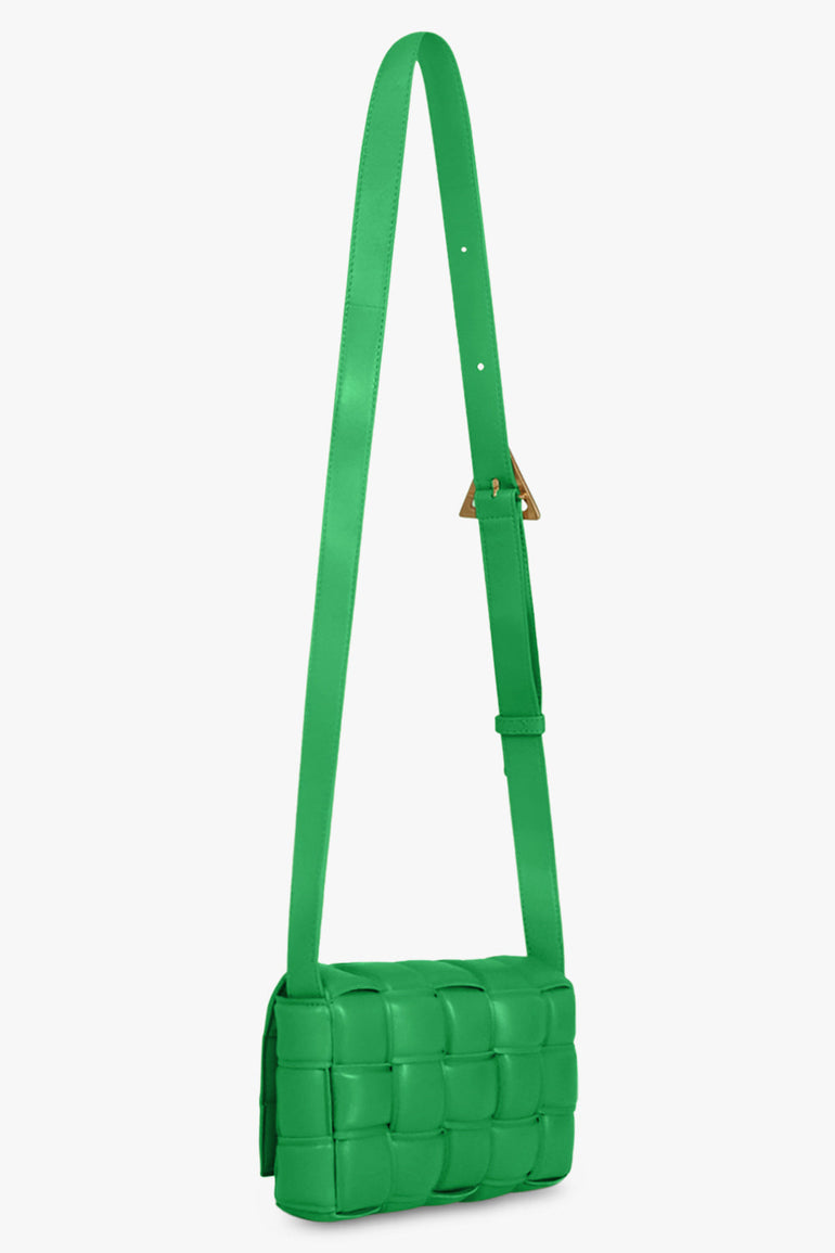 The Bottega Veneta Small Padded Cassette Bag and is the latest mini version of the cult favourite Padded Cassette. This bag is crafted with double-face strips in paper calf leather backed with soft Nappa in a padded weave design. It is designed with a slim adjustable calf strap with signature triangular buckle. It can be worn easily cross body or on the shoulder.