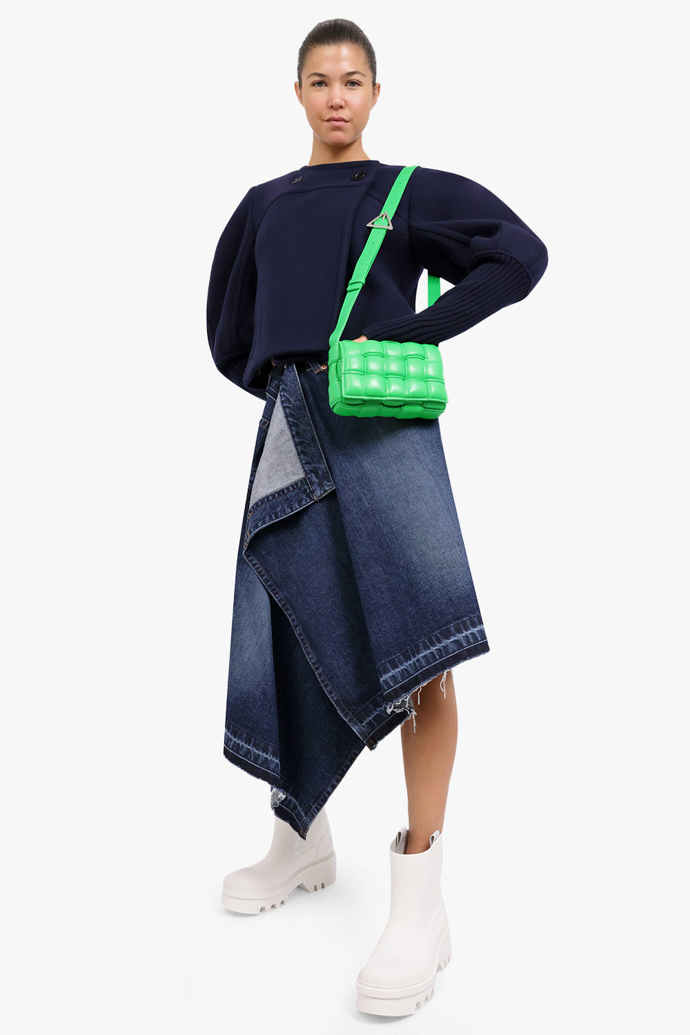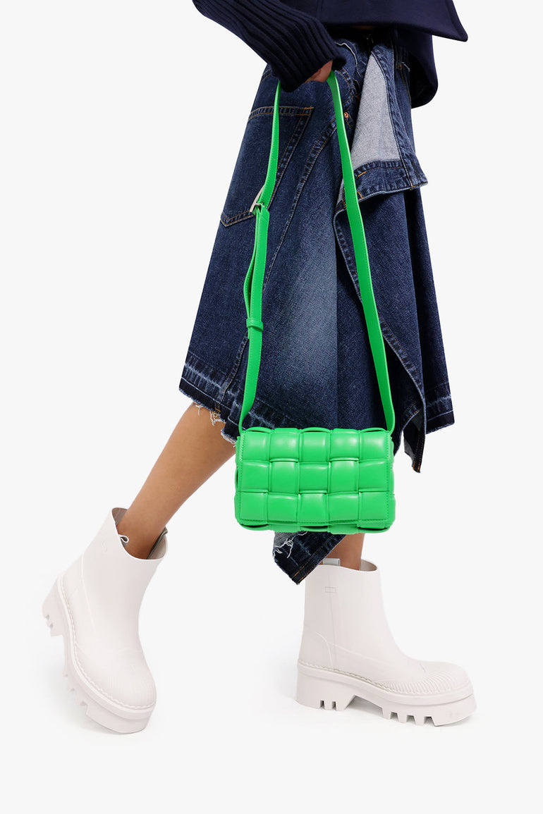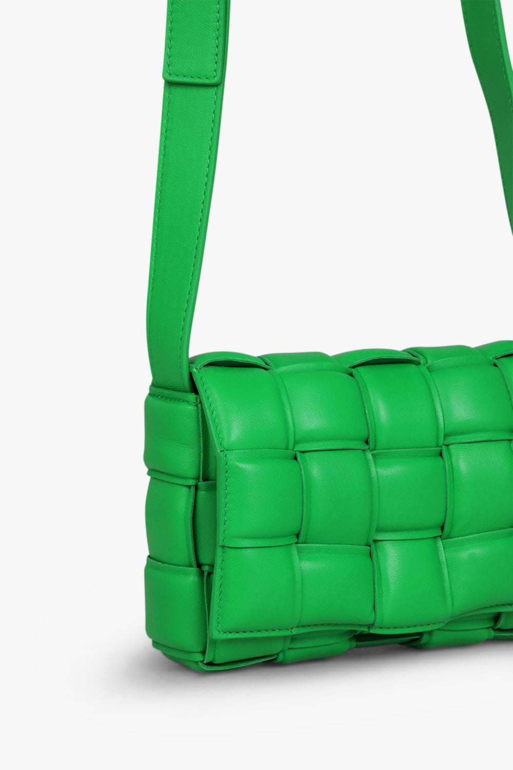 The Bottega Veneta Small Padded Cassette Bag and is the latest mini version of the cult favourite Padded Cassette. This bag is crafted with double-face strips in paper calf leather backed with soft Nappa in a padded weave design. It is designed with a slim adjustable calf strap with signature triangular buckle. It can be worn easily cross body or on the shoulder.