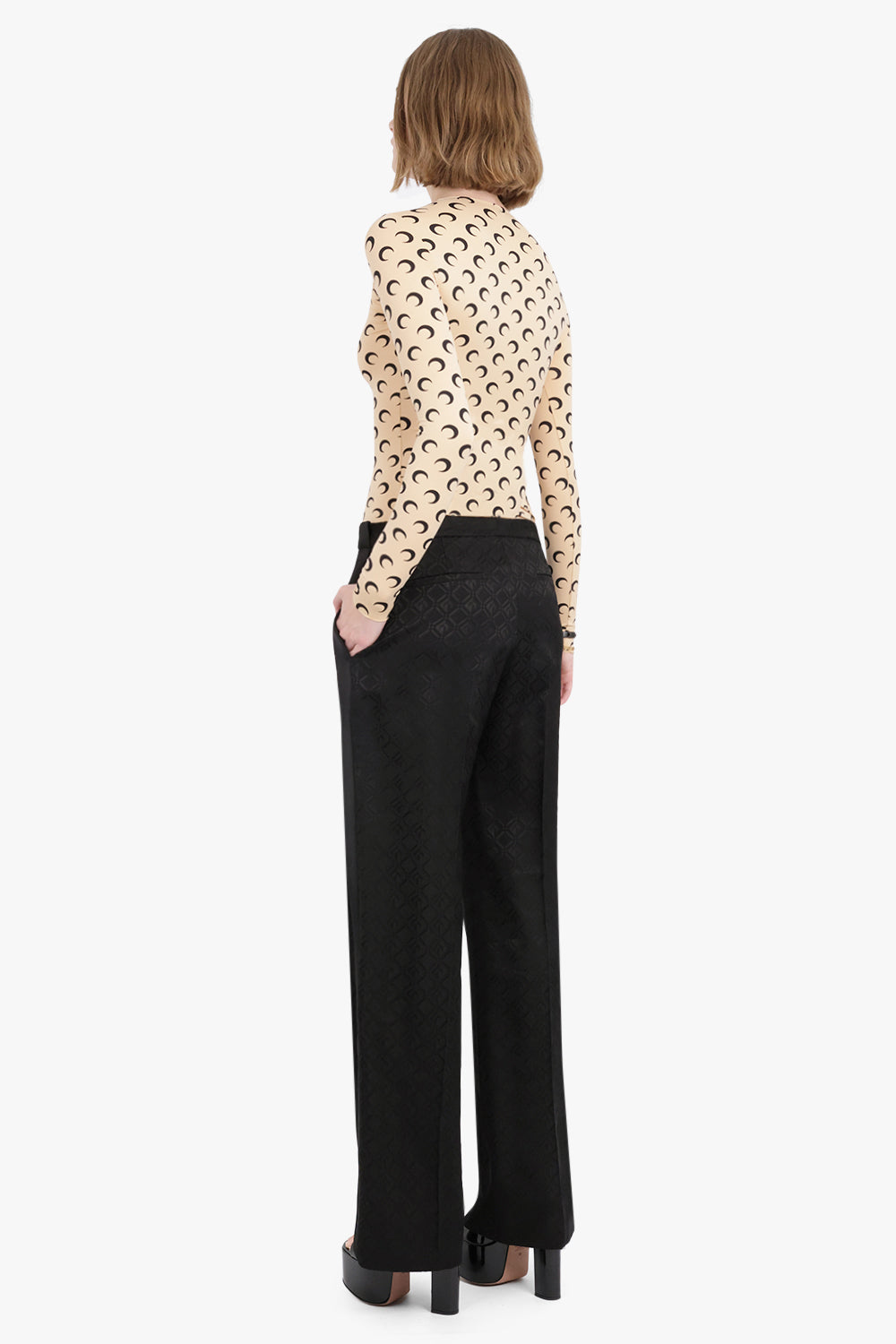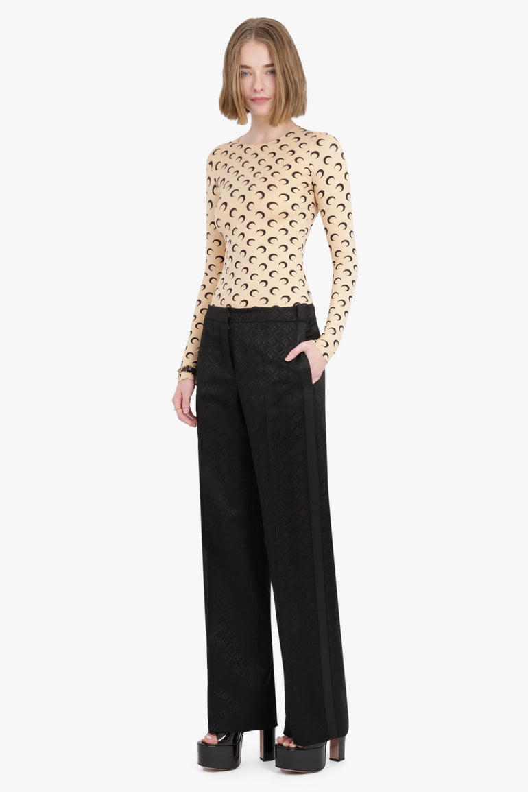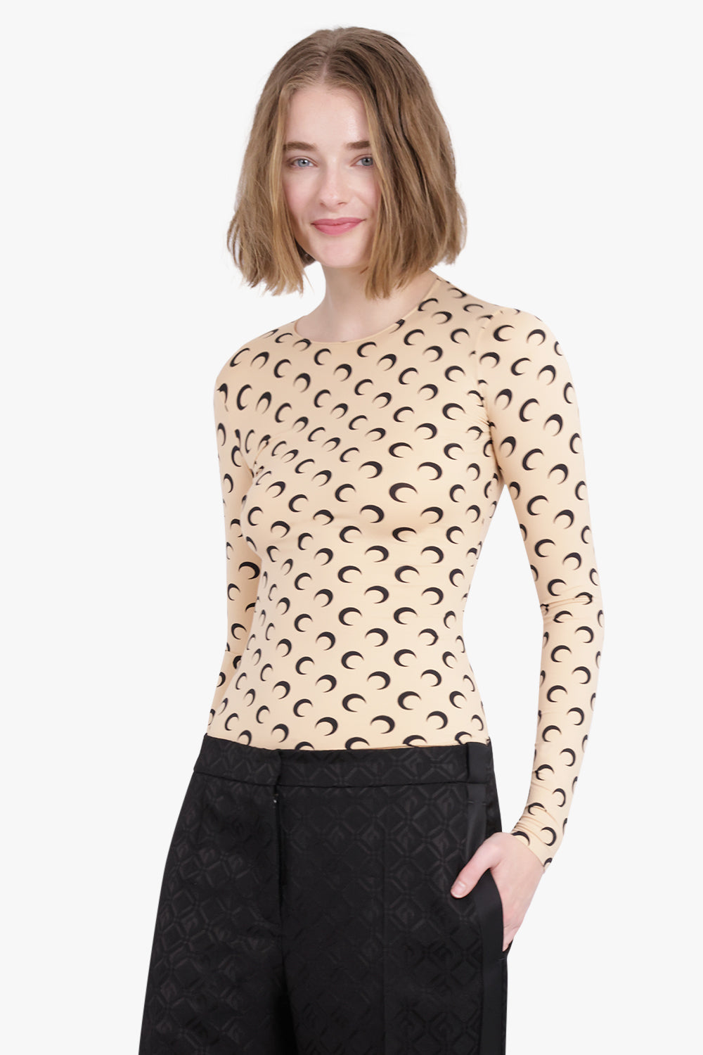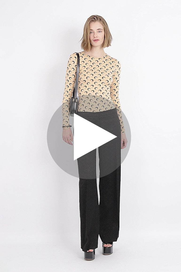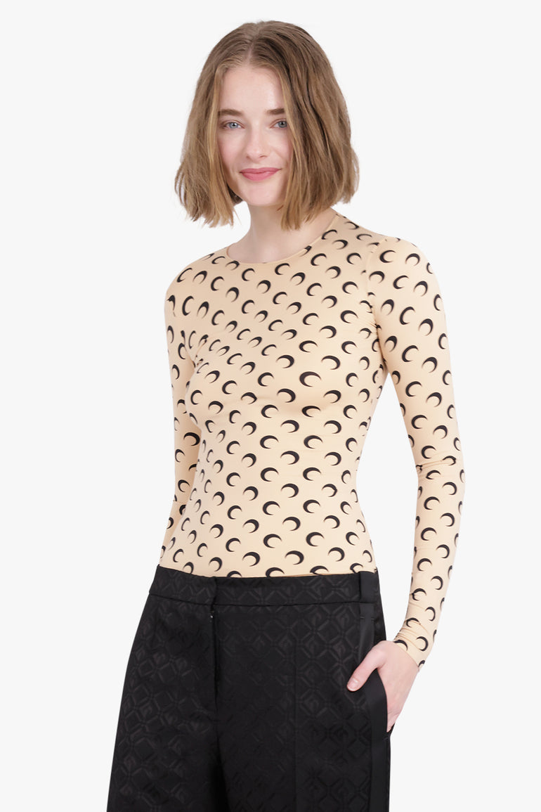 The Marine Serre Second Skin Moon Top is a fitted style crafted from a recycled stretch material, featuring long sleeves, a crew neckline and their signature moon print all over.