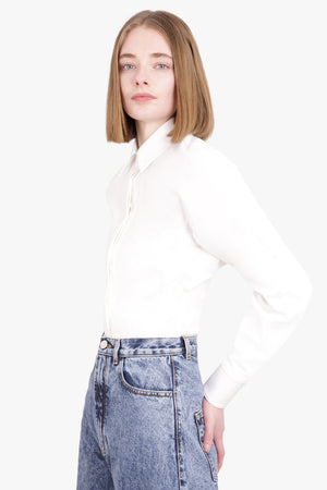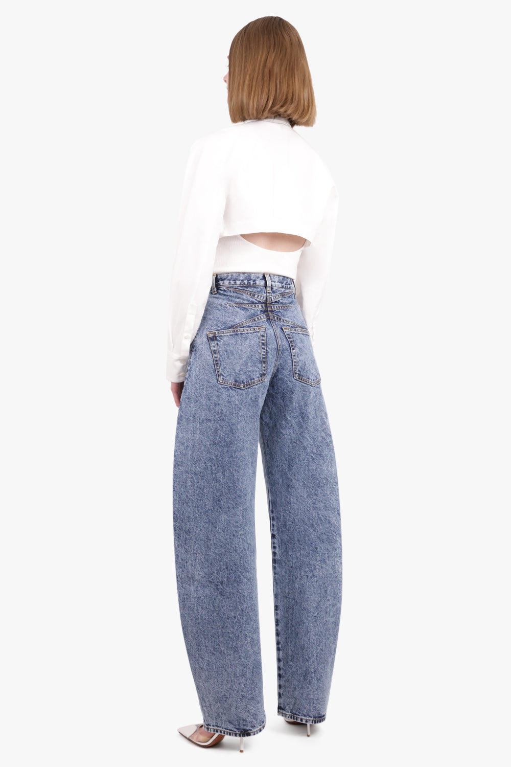 The Alaia Rounded Denim Pant are crafted in a heavy weight washed denim. The style is a high-waisted fit with a zip fly closure, and features a rounded knee height curve to create volume, before tapering down into a straight hemline.