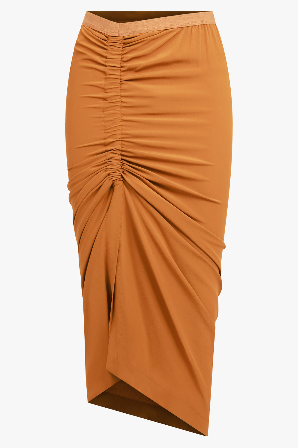 Discover the elegance of the Shrimp Midi Skirt in Clay, made with luxurious Cocoon Crepe stretch-jersey for a comfortable fit. Featuring a high waist and draped detailing, this mid-length skirt is designed with an elasticated band and rear slit for added style. The rear ruched detailing adds dimension, while the full lining and asymmetric hem provide a polished look. Finished with an elasticated waistband for a perfect fit.
