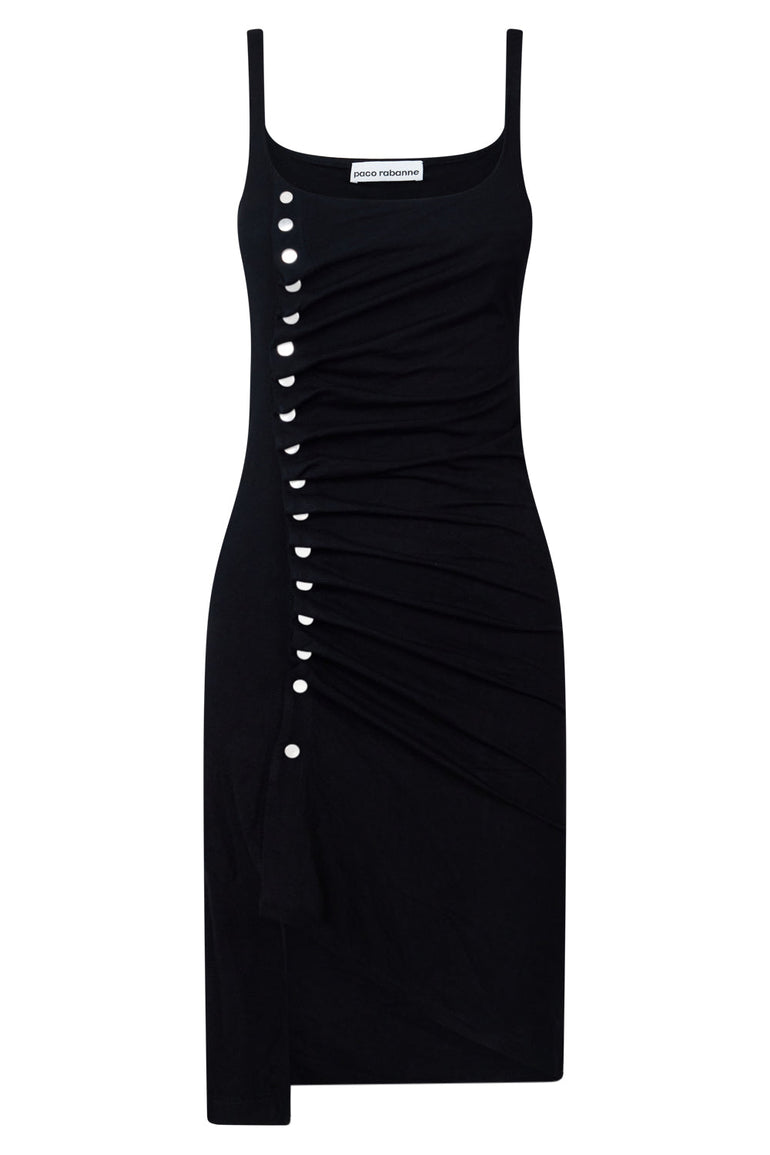PACO RABANNE RTW Sleeveless Button Down Ruched Asymmetric Lurex Mini Dress | Black