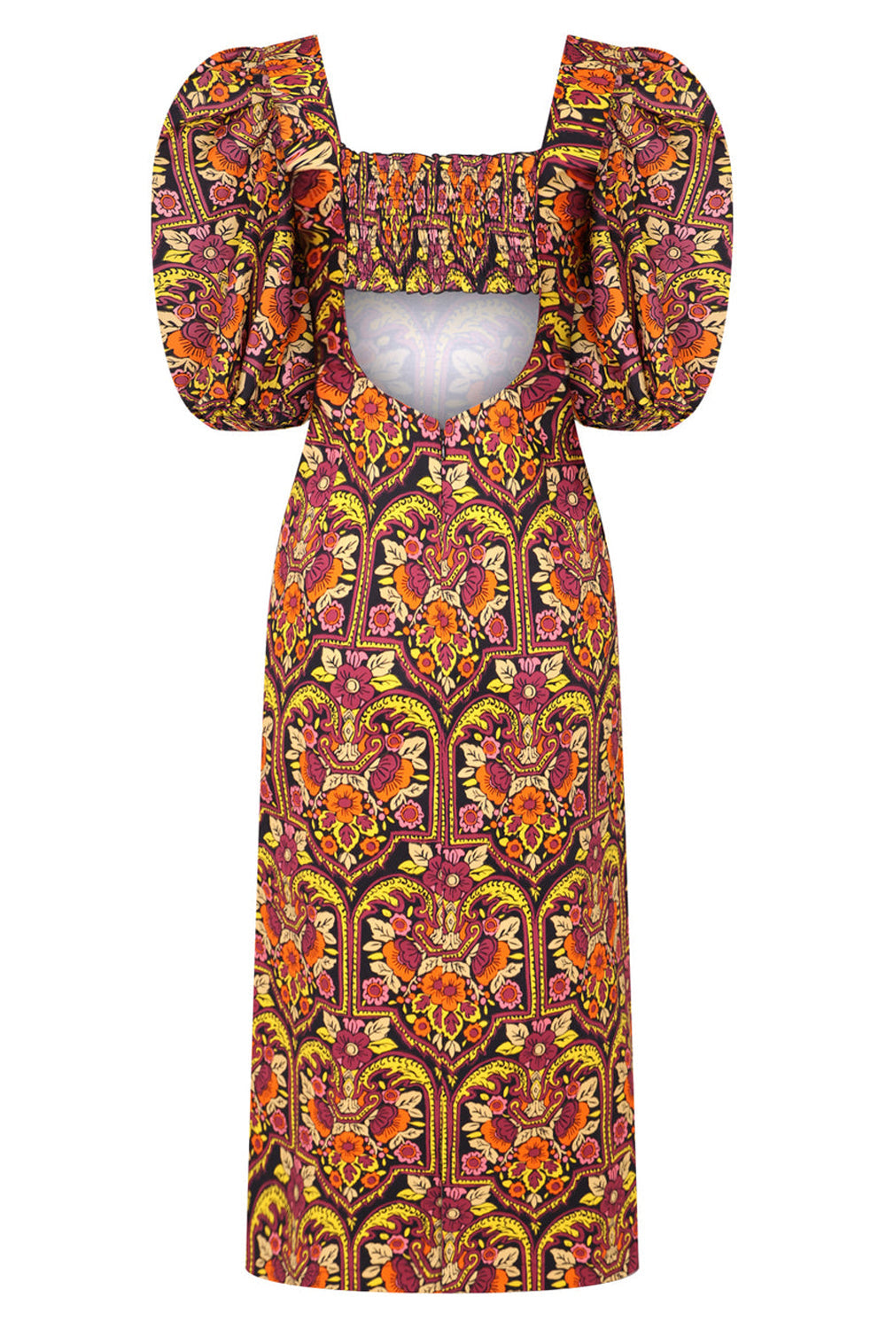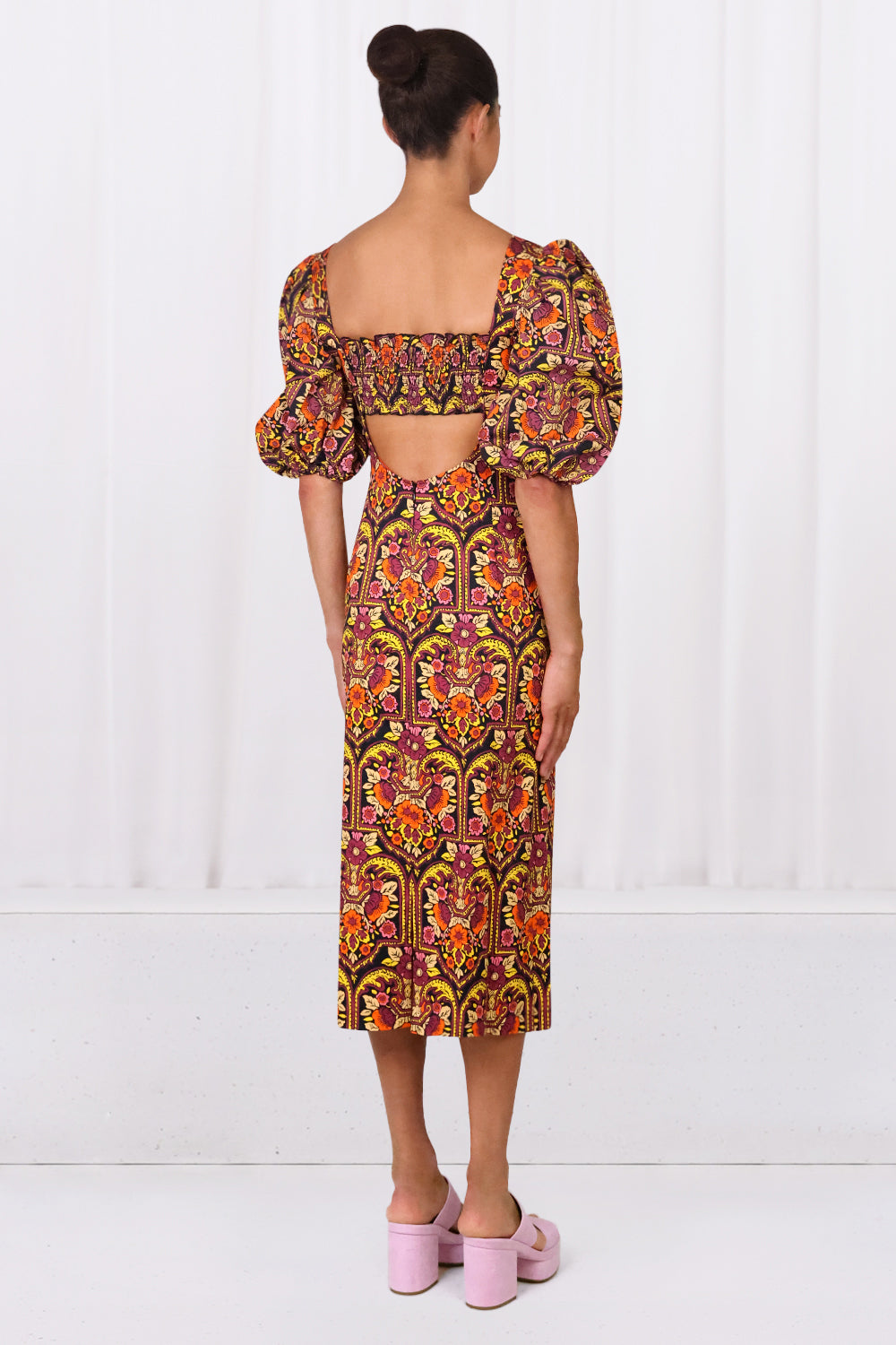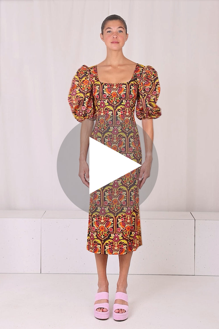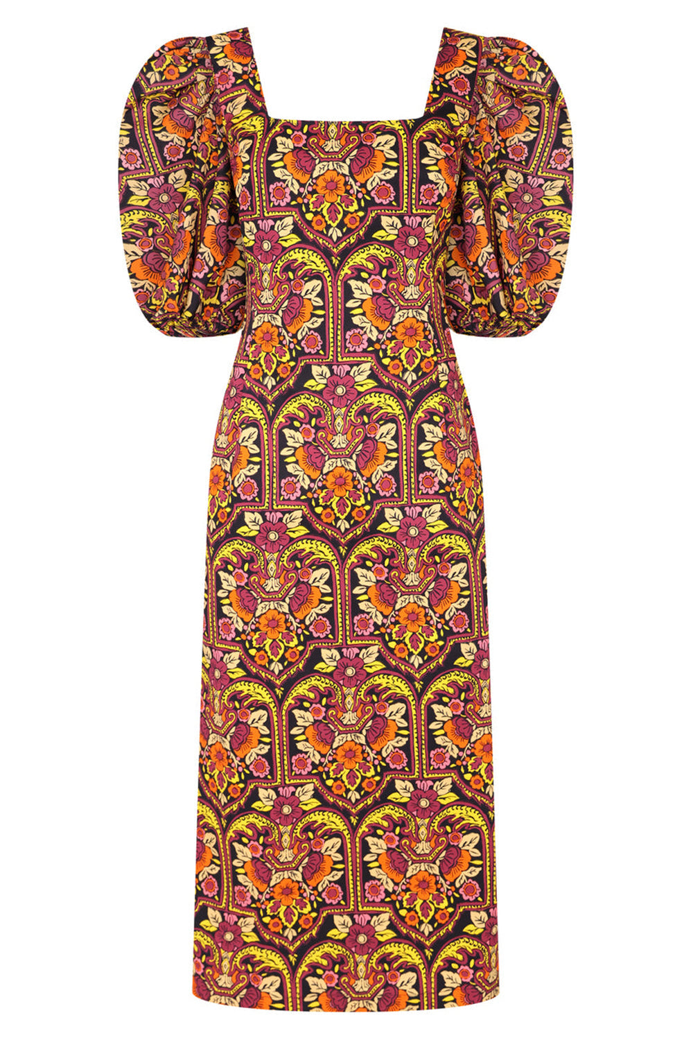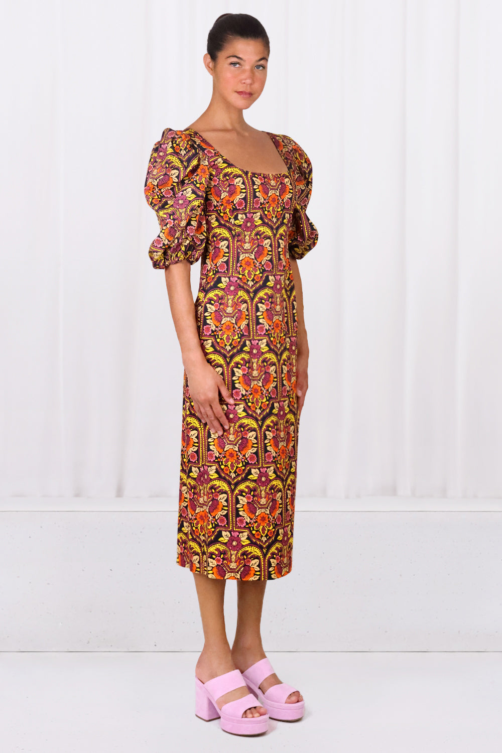 The La Double Sizzler Dress in Corte is crafted from a heavy cotton stretch. This style features a dramatic puffed sleeve, with a sleek pencil fit through the skirt.