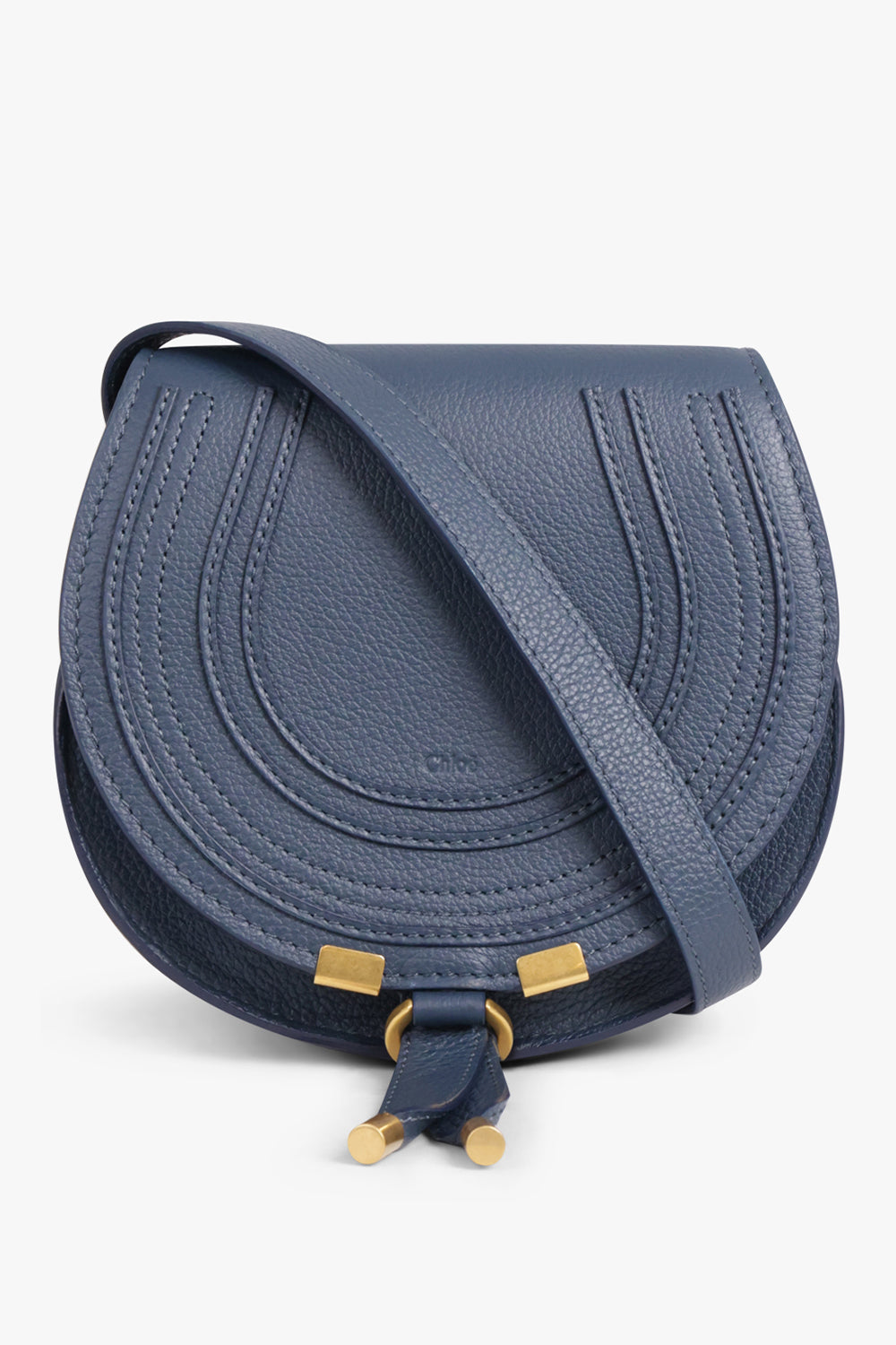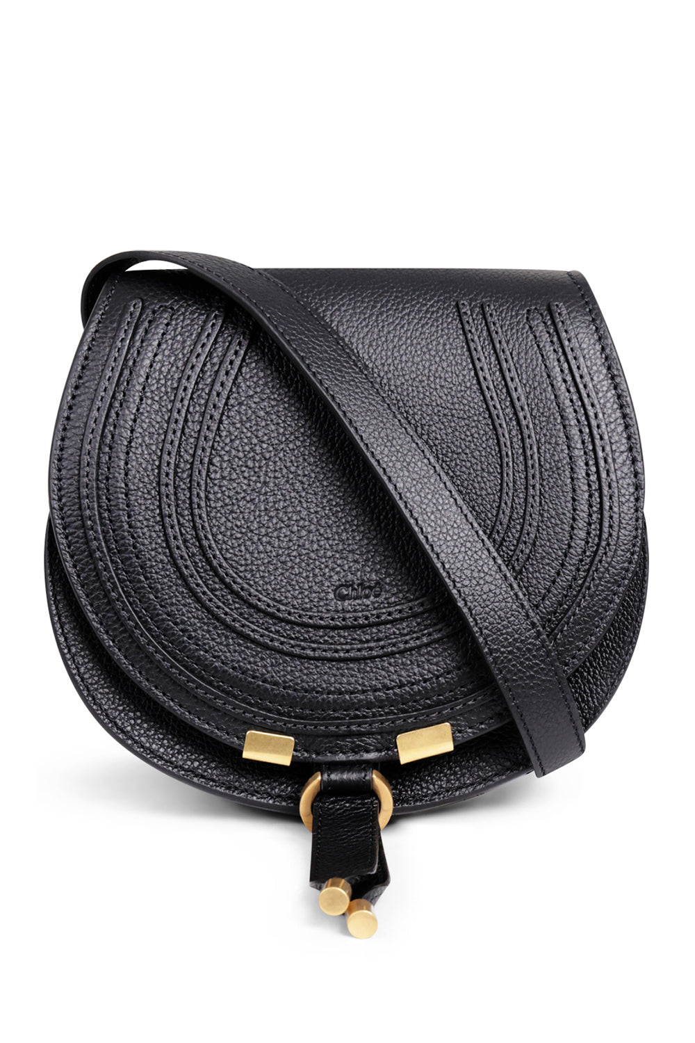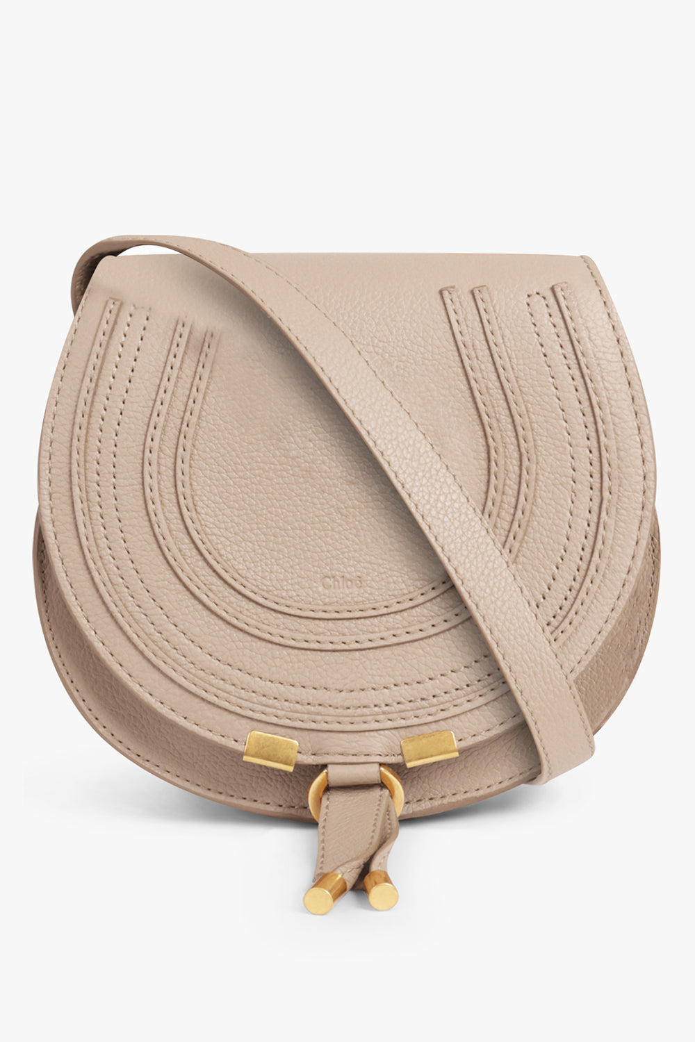 The Chloe Marcie Small Bag is a structured grained calfskin shoulder bag. True to the iconic Marcie line, this practical and compact bag combines a distinct 70's spirit with a romantic, bohemian touch. The harmonious mix of a clean top-line and round silhouette is typical of the Maison's play on masculine and feminine notes.It features a foldover flap with cinch fastening at main compartment, embossed logo and concealed welt pocket at face. The luxurious small grain calfskin is embellished with saddle stitches for equestrian appeal, while the glint of brass hardware and dangling tassel bring a feminine flourish.