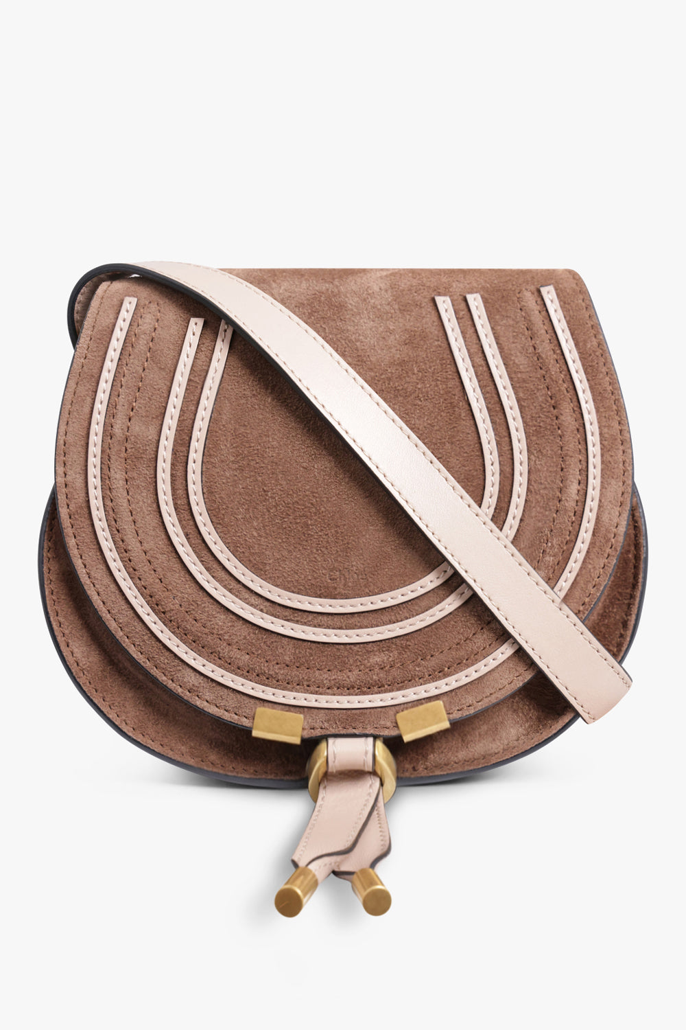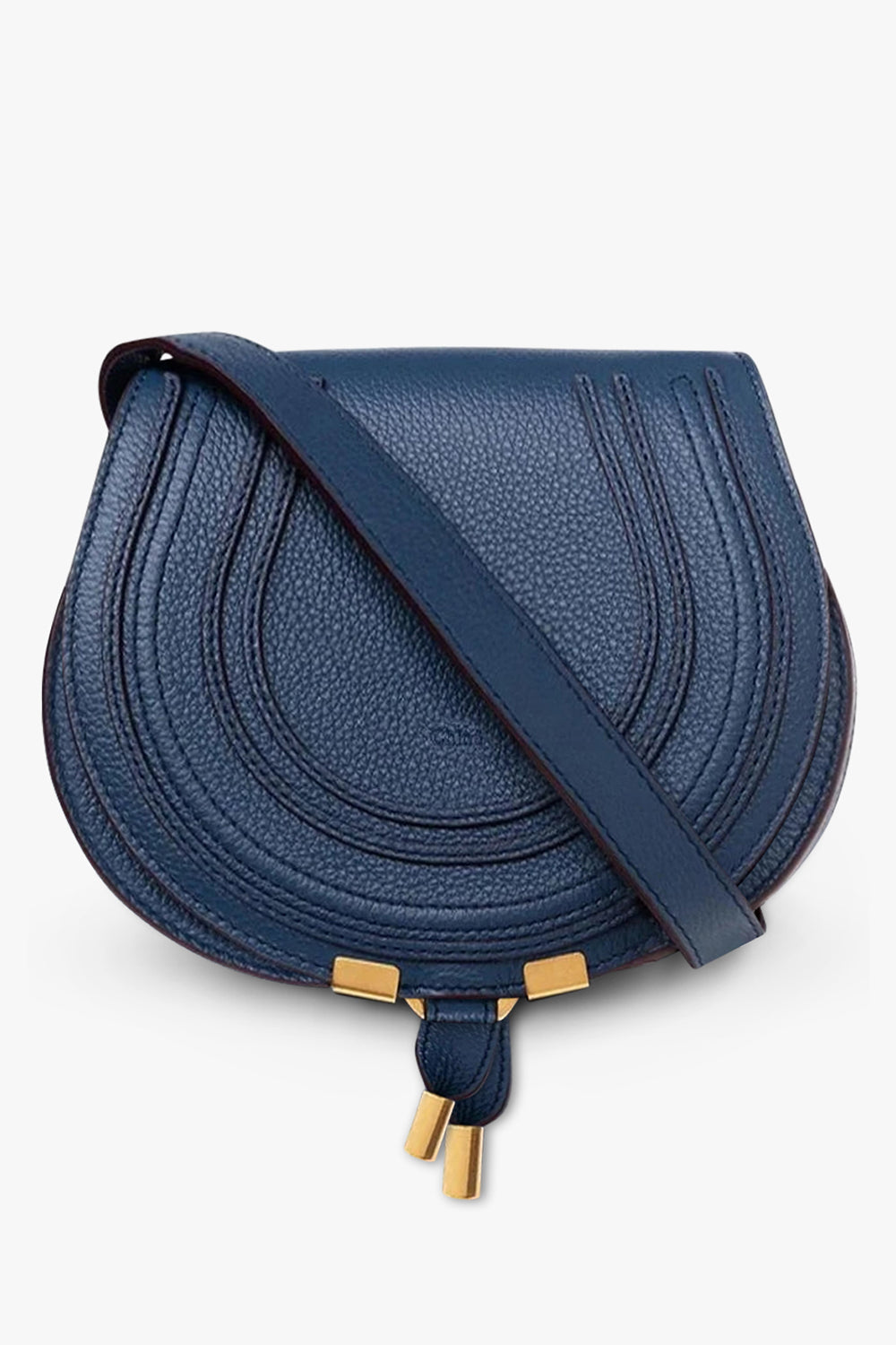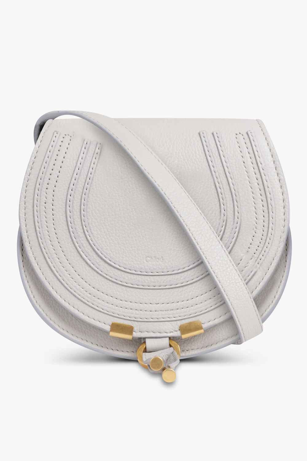 The Chloe Marcie Small Bag is a structured grained calfskin shoulder bag. True to the iconic Marcie line, this practical and compact bag combines a distinct 70's spirit with a romantic, bohemian touch. The harmonious mix of a clean top-line and round silhouette is typical of the Maison's play on masculine and feminine notes.It features a foldover flap with cinch fastening at main compartment, embossed logo and concealed welt pocket at face. The luxurious small grain calfskin is embellished with saddle stitches for equestrian appeal, while the glint of brass hardware and dangling tassel bring a feminine flourish.