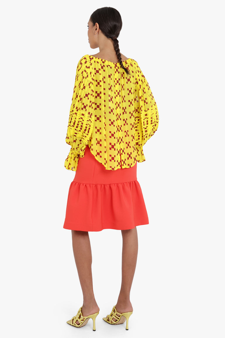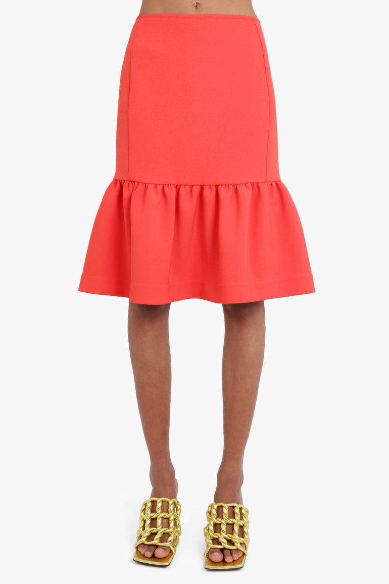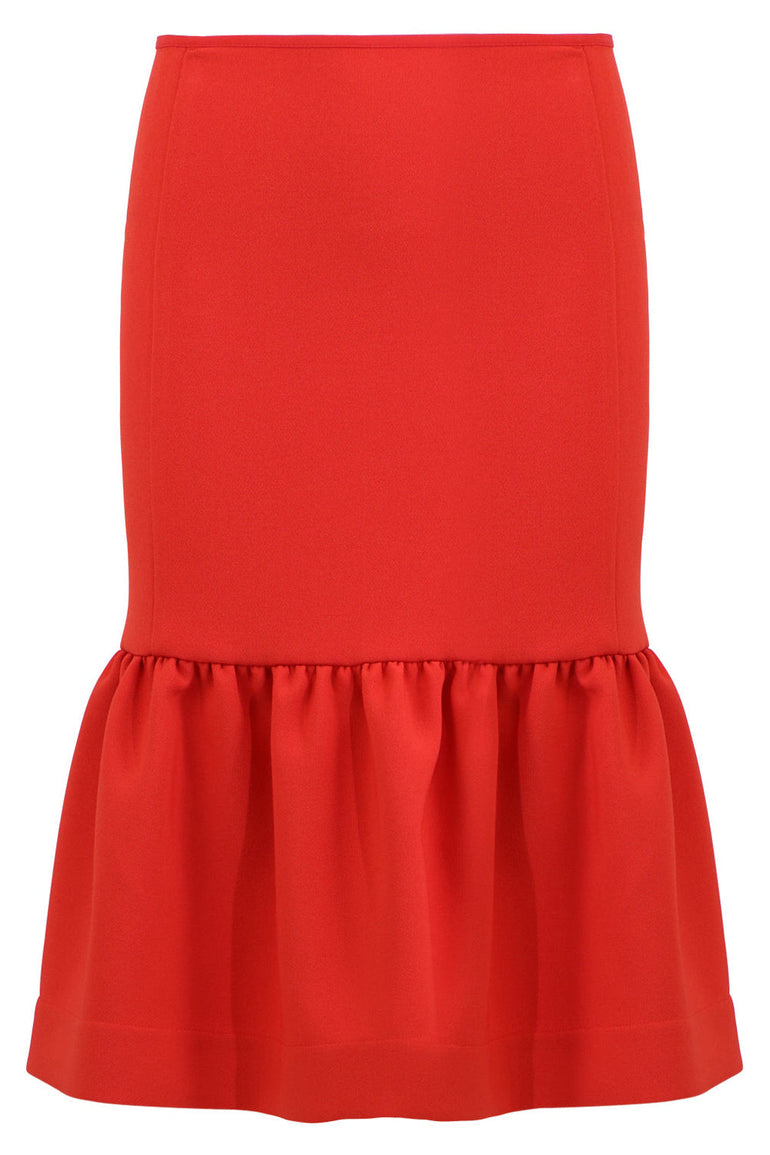 Maison Poi Peplum裙子是一个Midi风格,旨在坐在臀部上方。它配有一个带有荷叶边的剪影。拉链闭合。