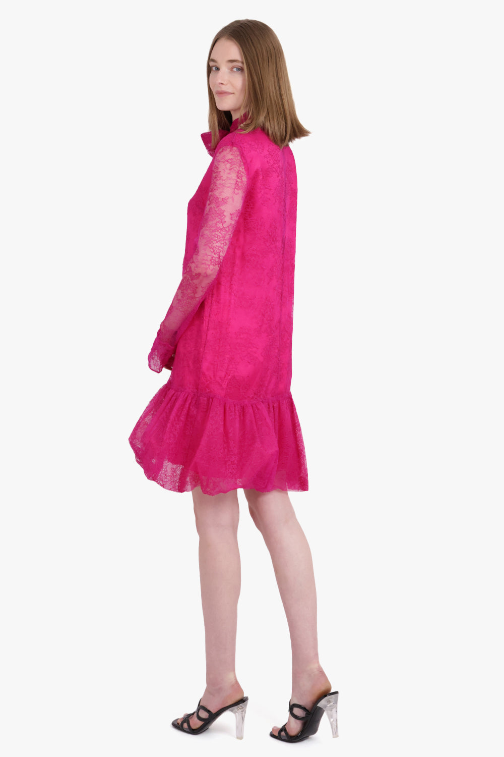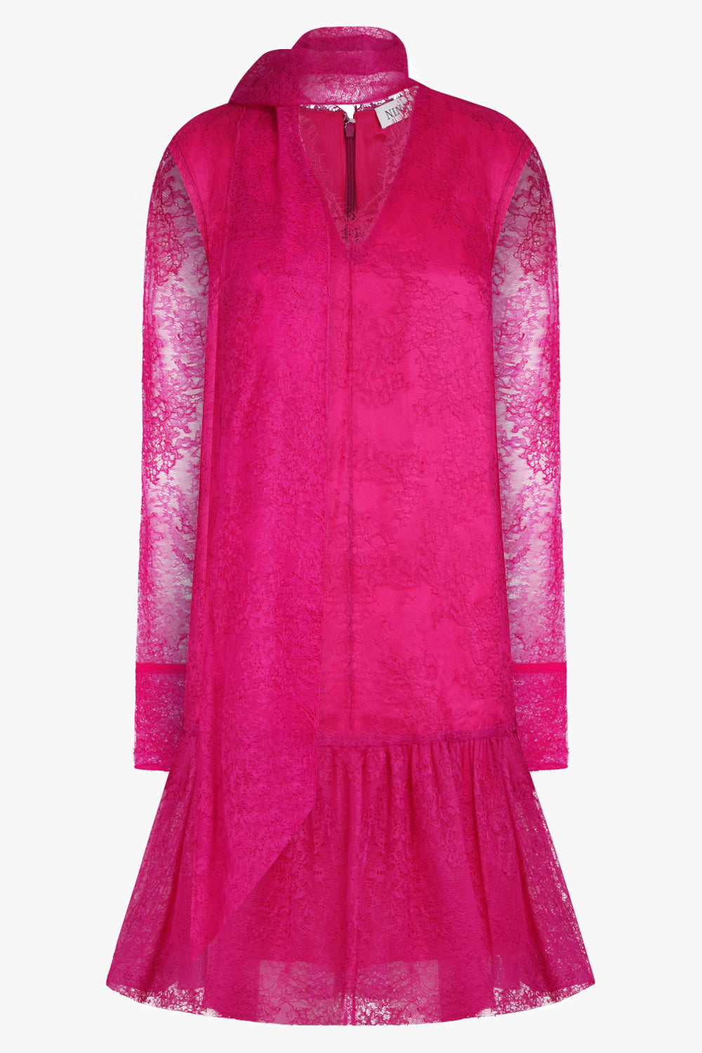 NINA RICCI RTW V-Neck Ruffle Lace Dress | Fuschia