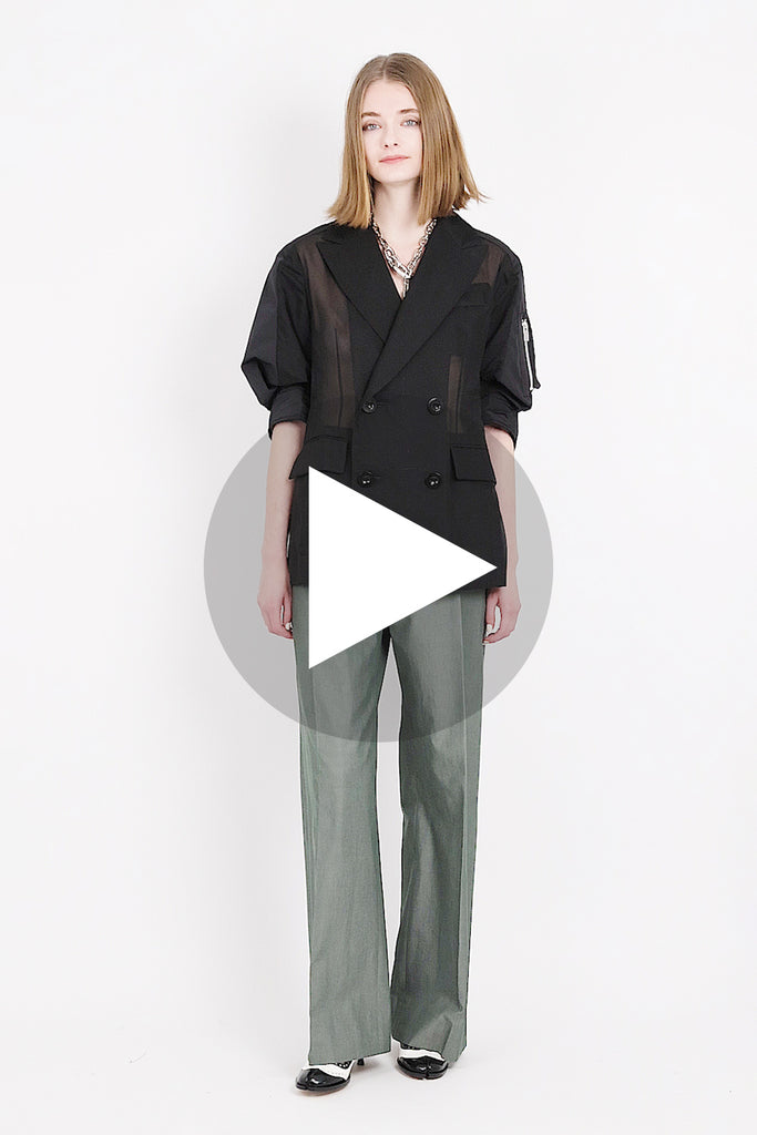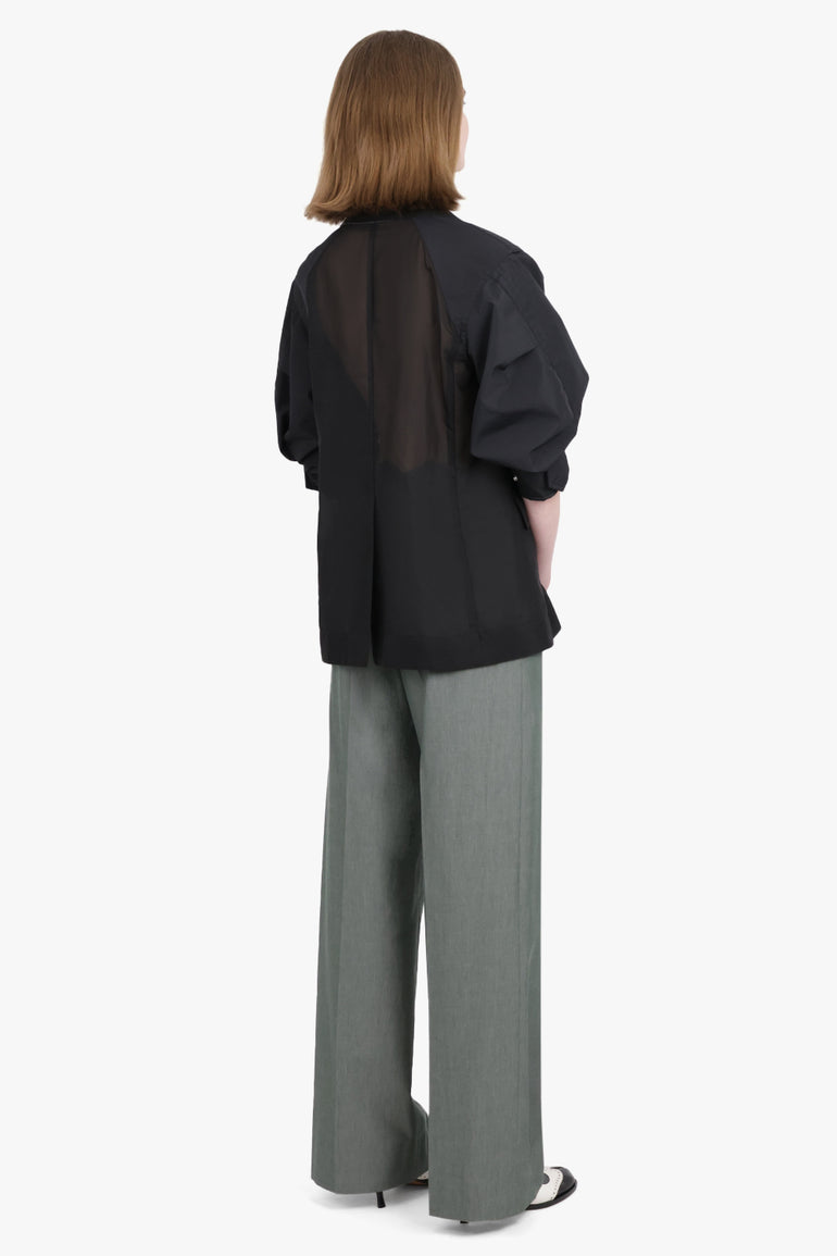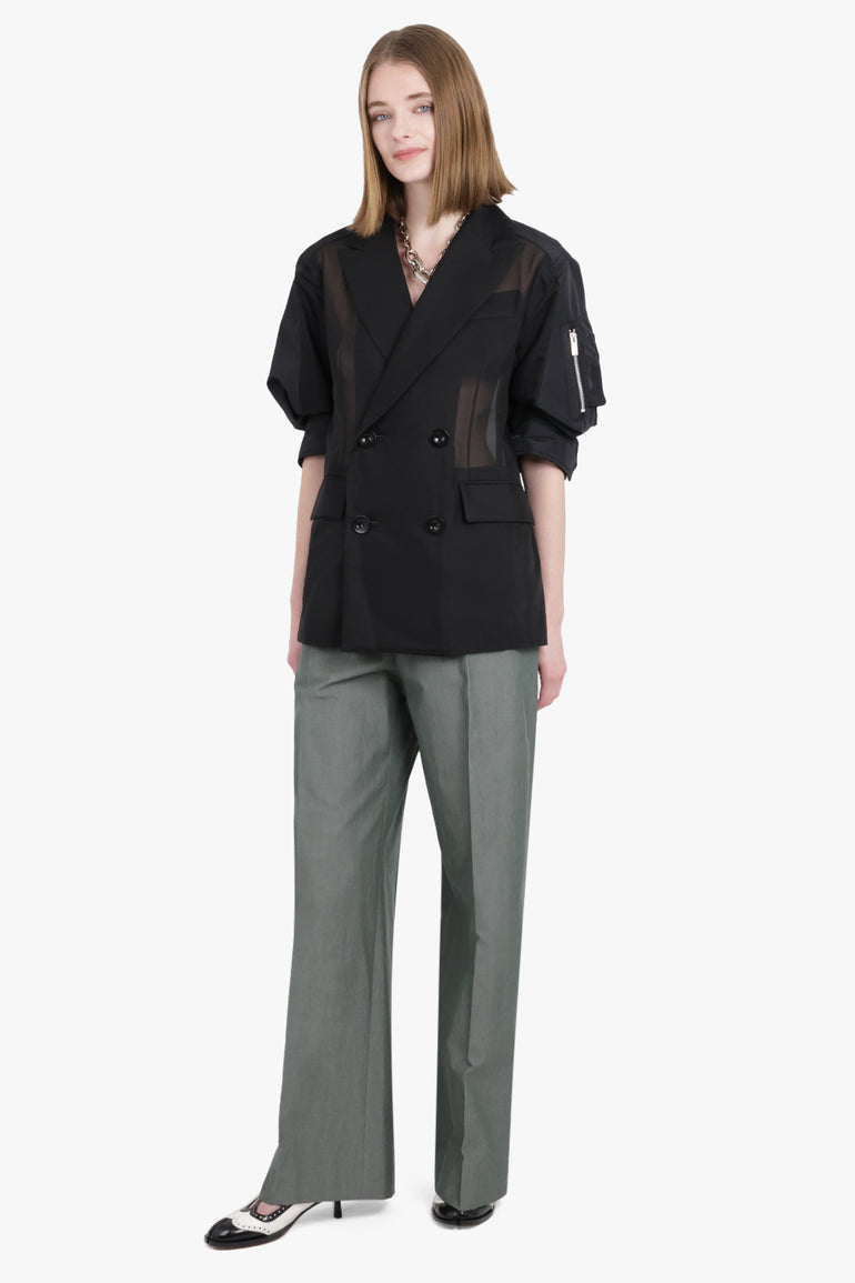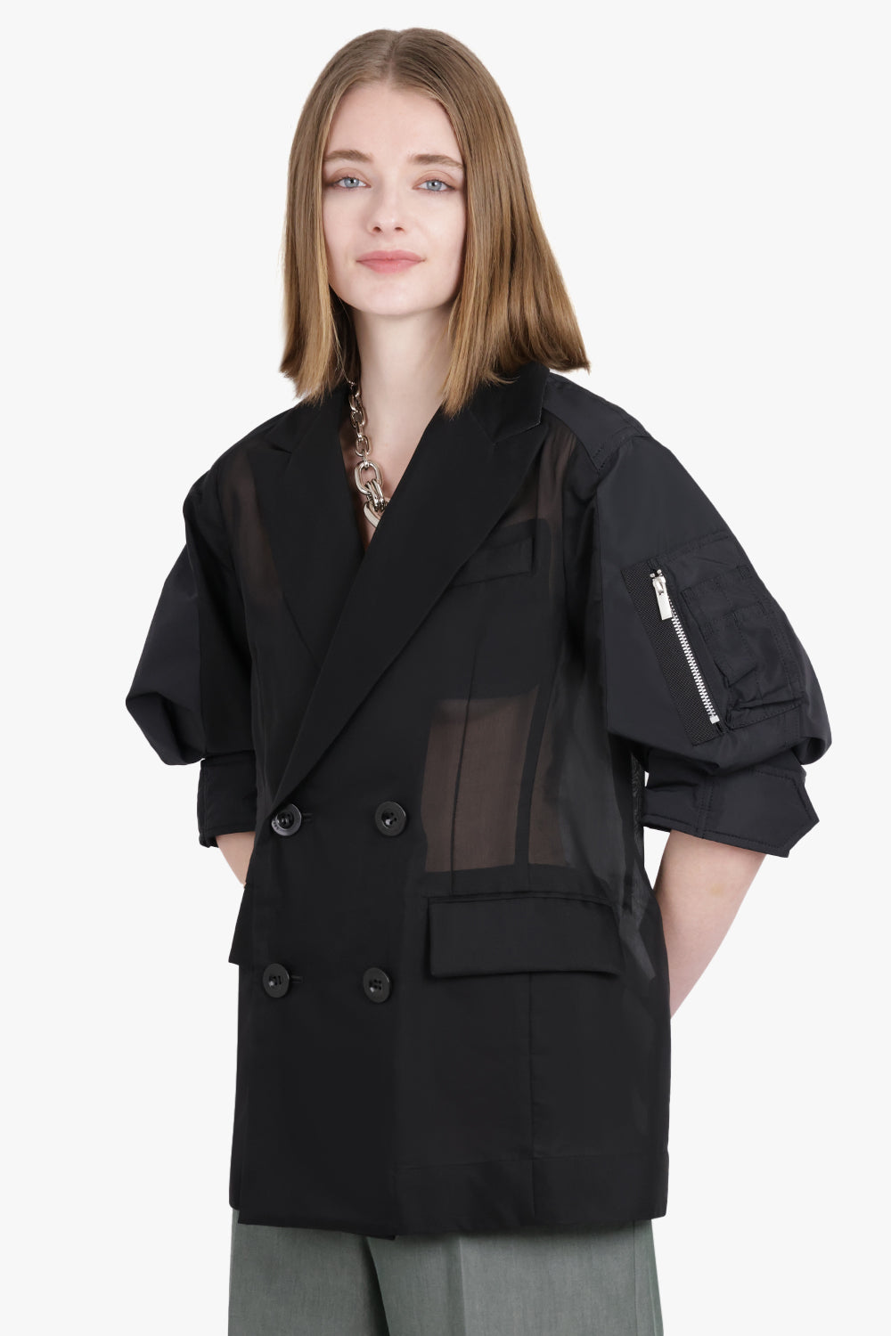 Crafted from a blend of cotton and voile, this blazer features a semi-sheer design and a double-breasted closure with logo buttons. It also includes a 3/4 length nylon bomber sleeve, convenient pockets, and a back central vent.
