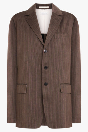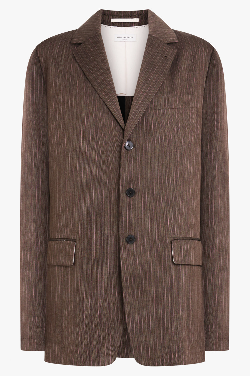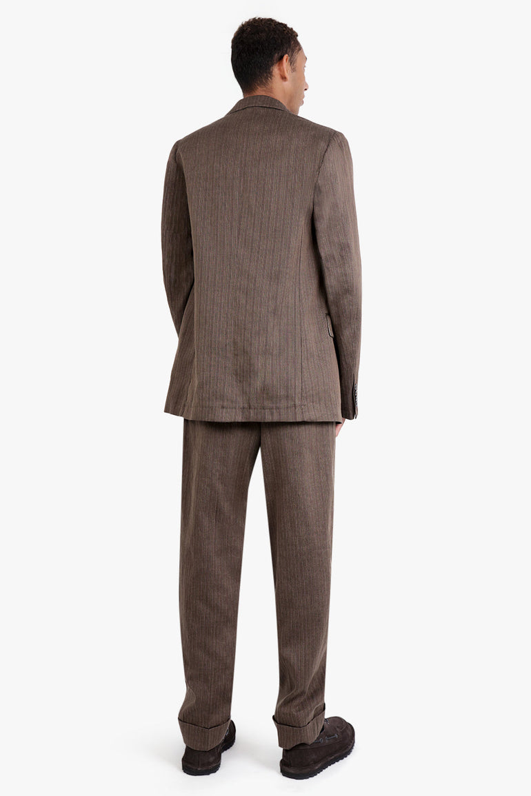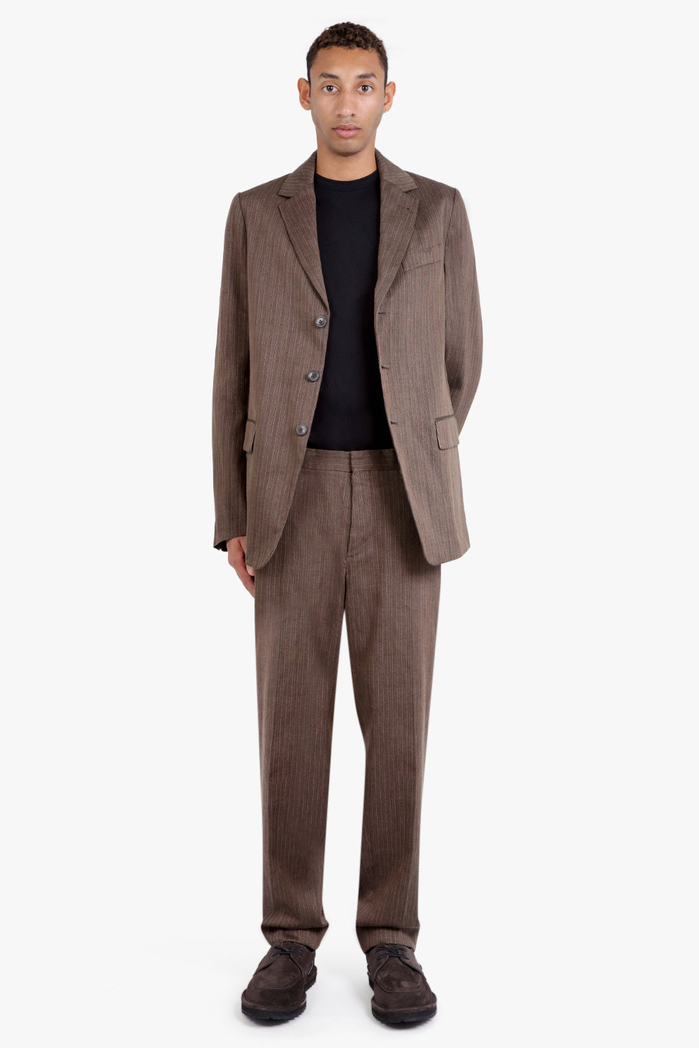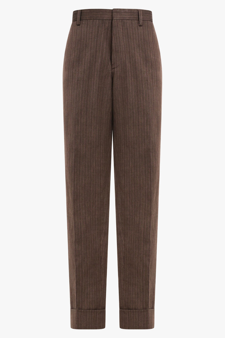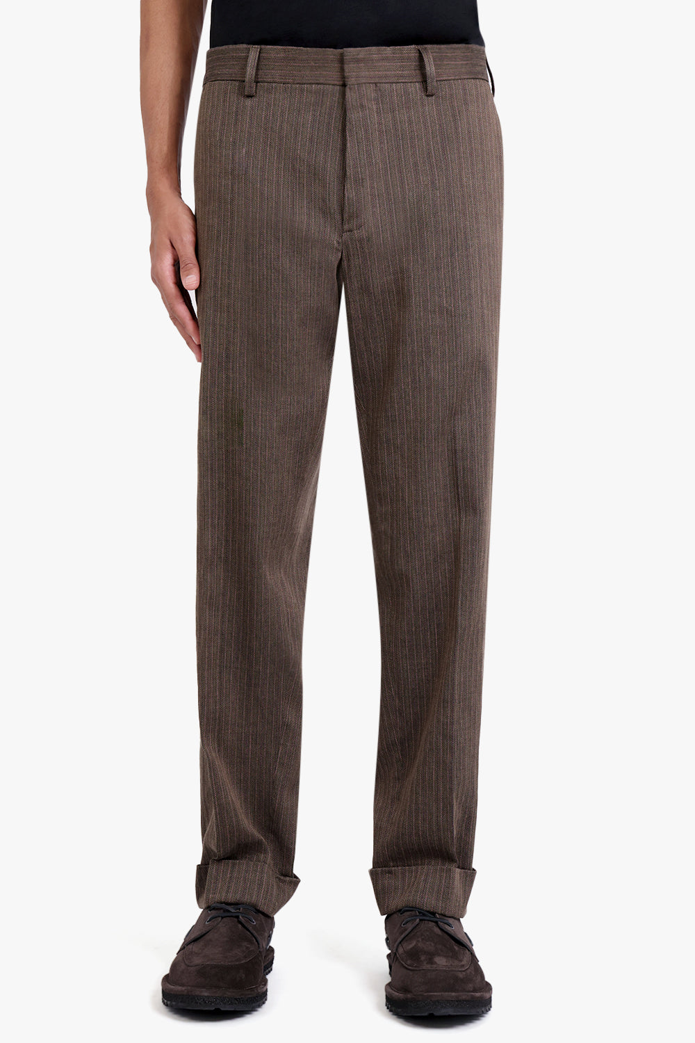 Dries Van Noten Washed Cotton Linen Polyester Stripe On Herringbone Structure . The design is cut into a slim-fitting silhouette and has a concealed button at the waist.