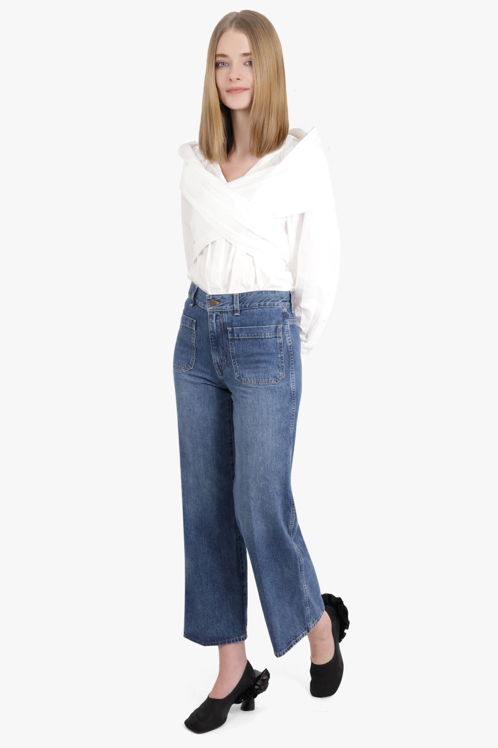 Expertly crafted from washed denim, these Night Blue jeans feature contrast stitching and a high-rise waist for a figure-flattering fit. The classic five pockets and belt loops add functionality, while the logo patch on the rear adds a touch of branding. The wide leg design gives a timeless, sophisticated look, and the concealed fly and button fastening keep the silhouette clean and streamlined.