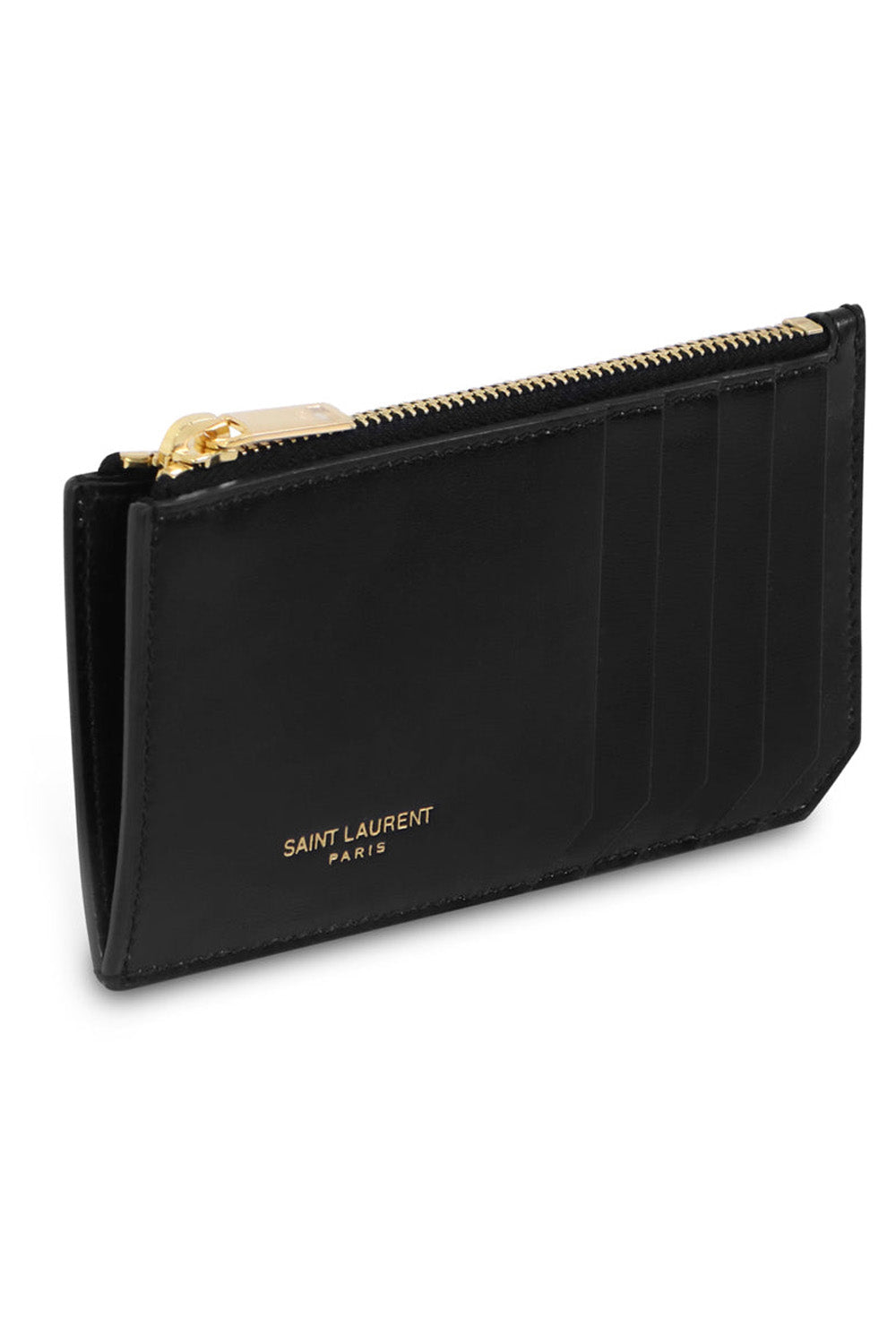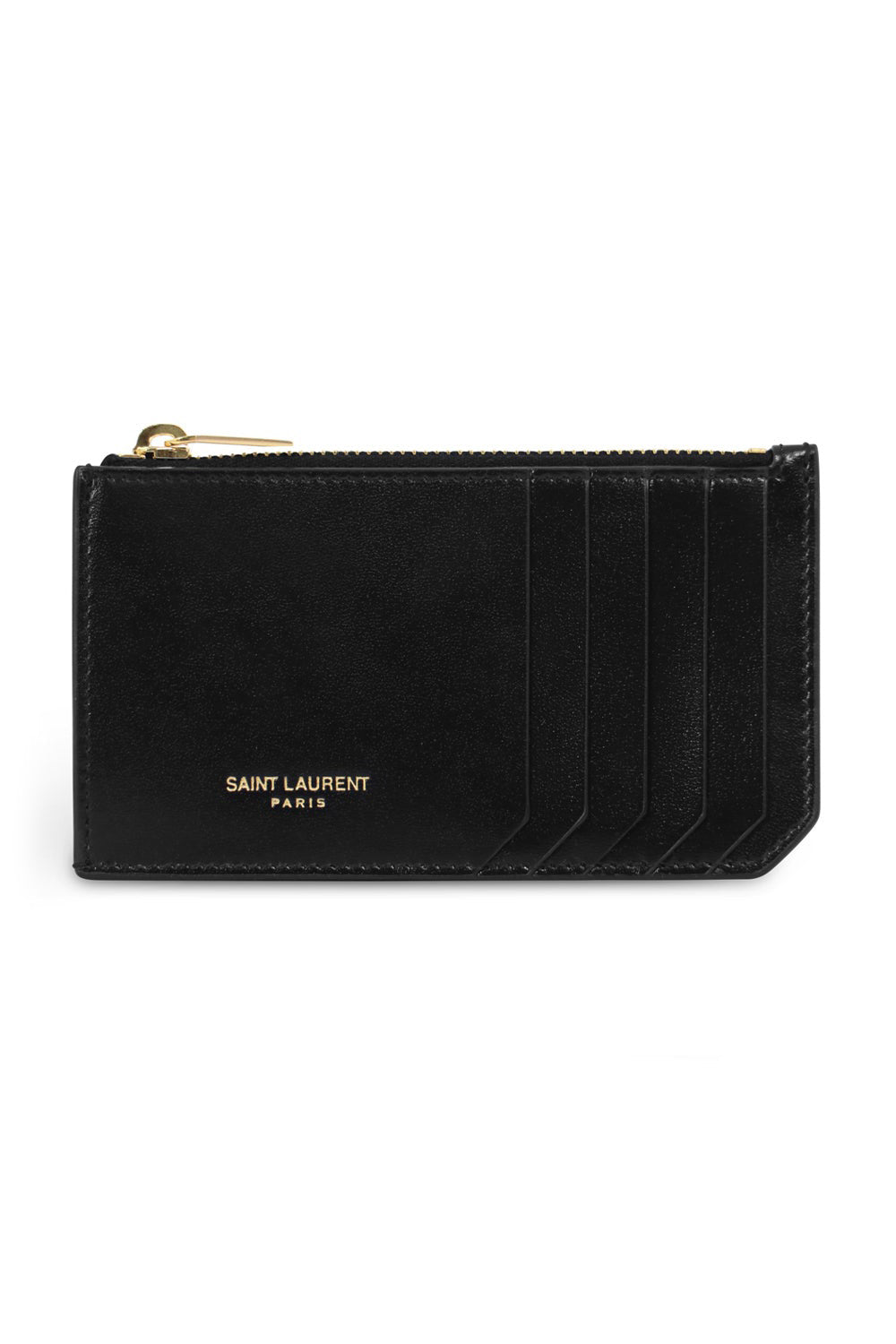 Saint Laurent Card Holder是一个男式钱包,具有多个卡槽,前压花徽标印章,顶部拉链封闭和金色硬件。完美的礼物!